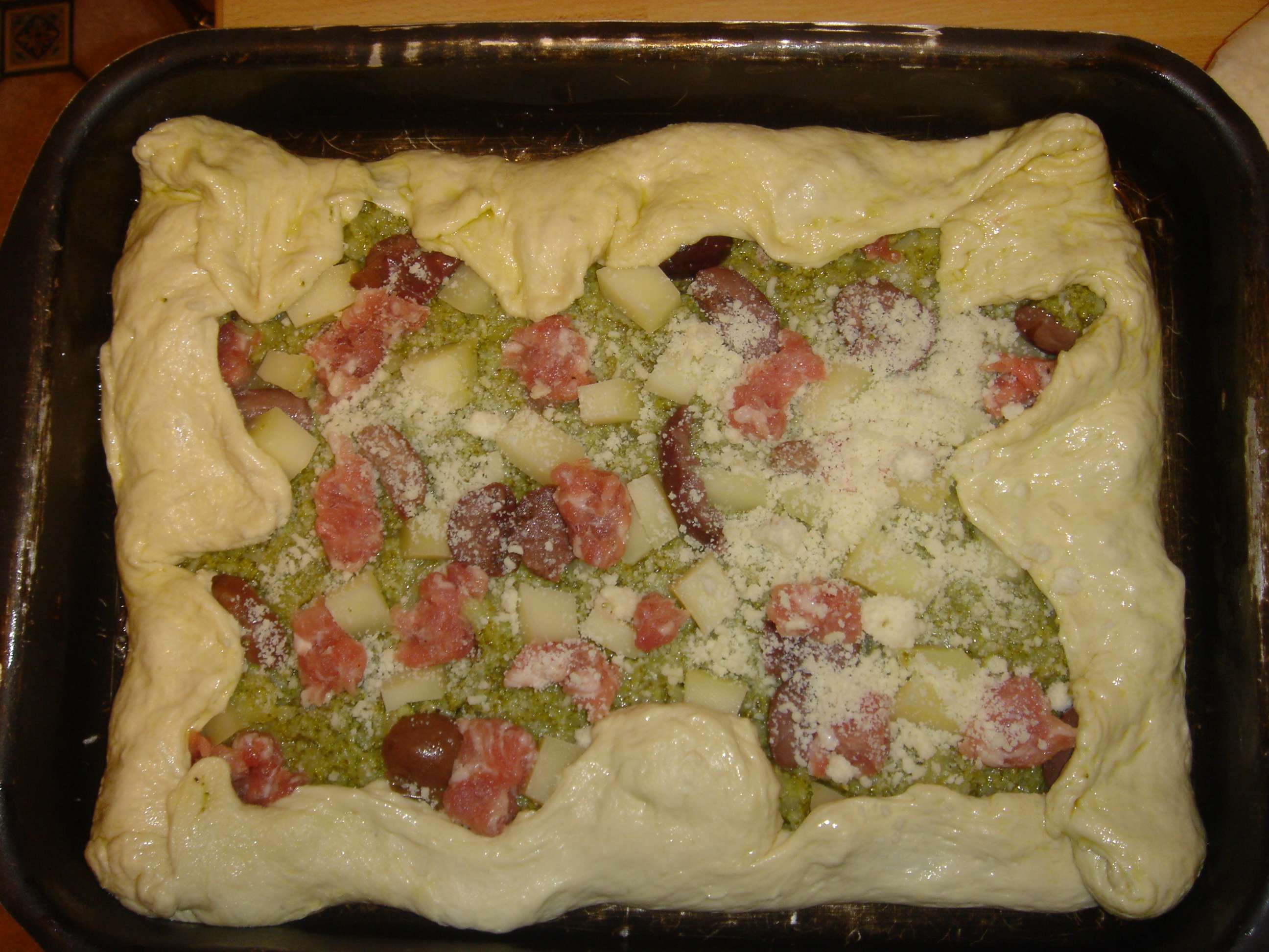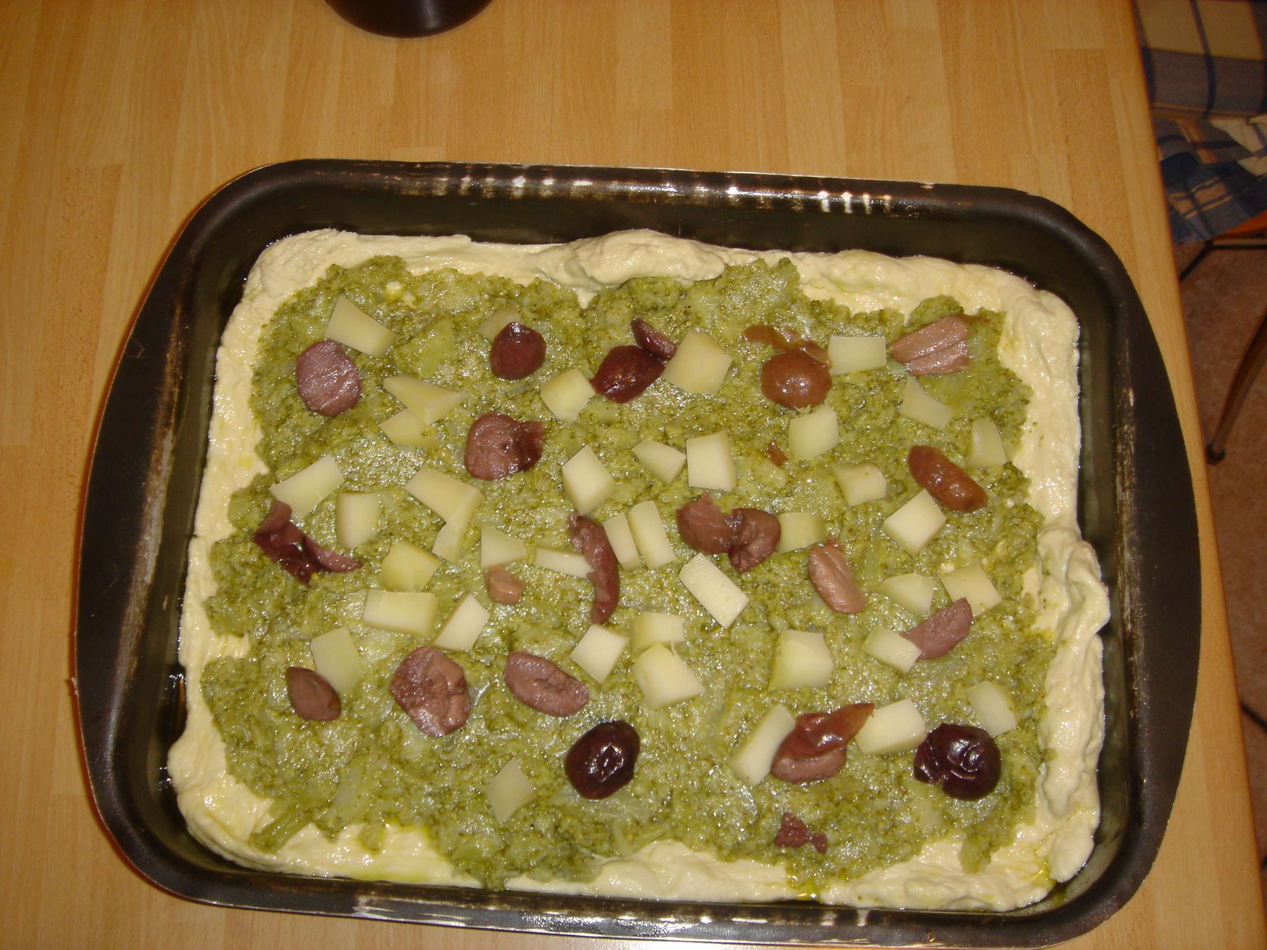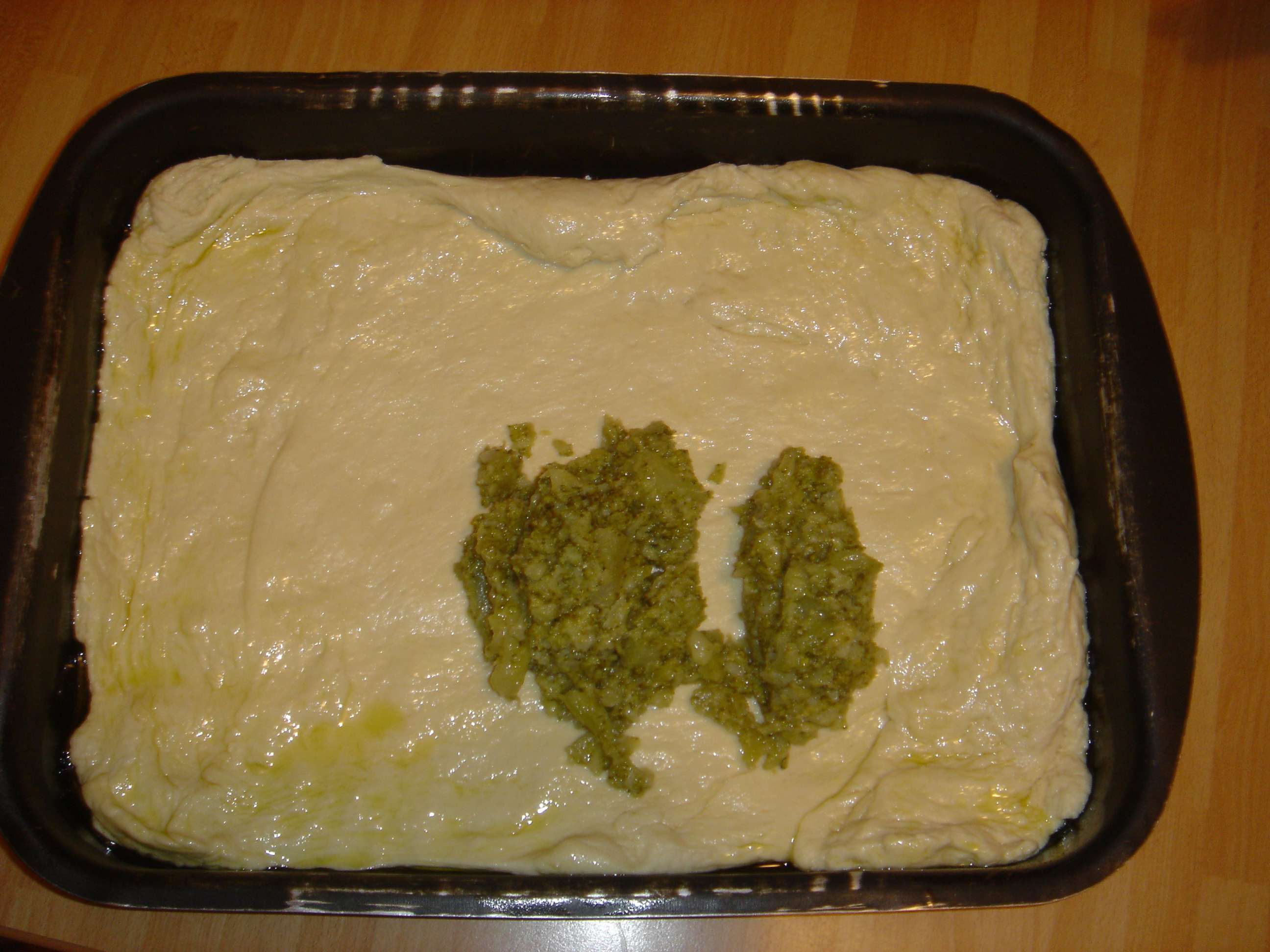 Quando la pasta sarà lievitata dividerla in 2 parti. Oleare una teglia rettangolare (25X35) e distendere la prima parte di pasta.