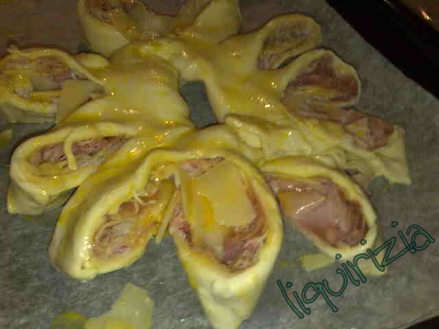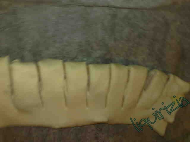 quando ho fatto tutte i tagli arrotolo a cerchio la pasta facendo attenzione a non far uscire il ripieno dalla pasta e GIRO su sè stessi i petali facendo un mezzo giro e appoggiando la pasta sulla carta in modo che a contatto della carta ci sia la pasta