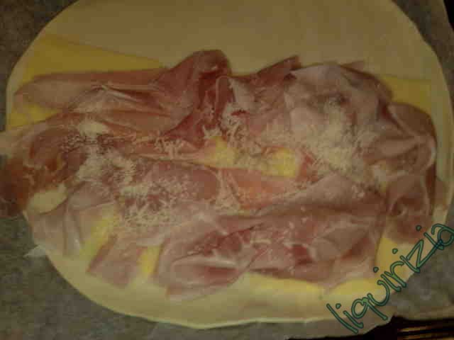 fare strati di formaggio scamorza a fette tagliate in precedenza e parmigiano a scaglie intervallati da prosciutto