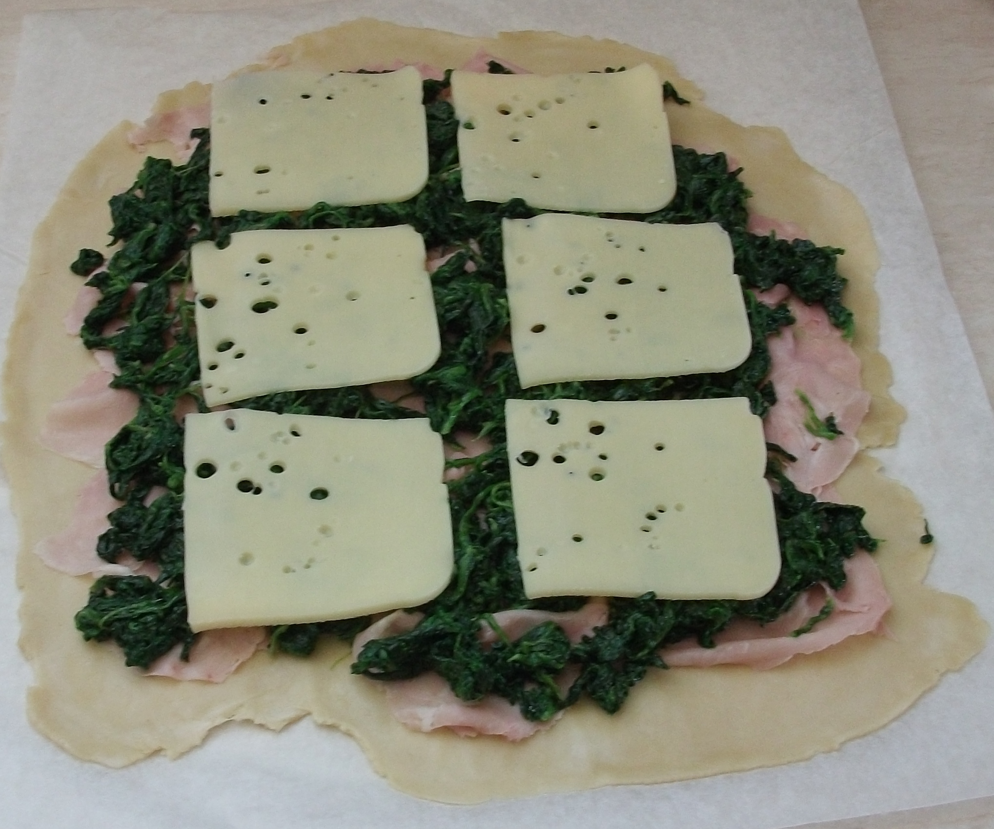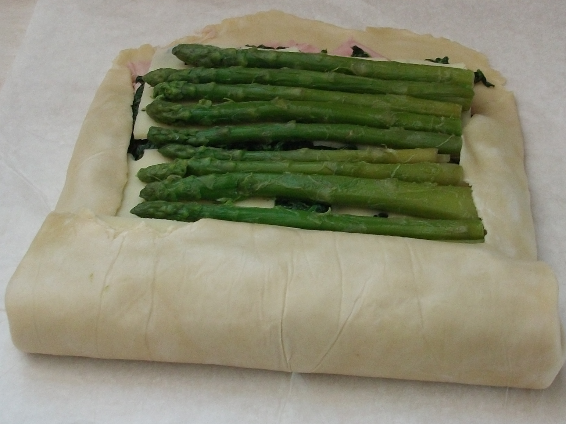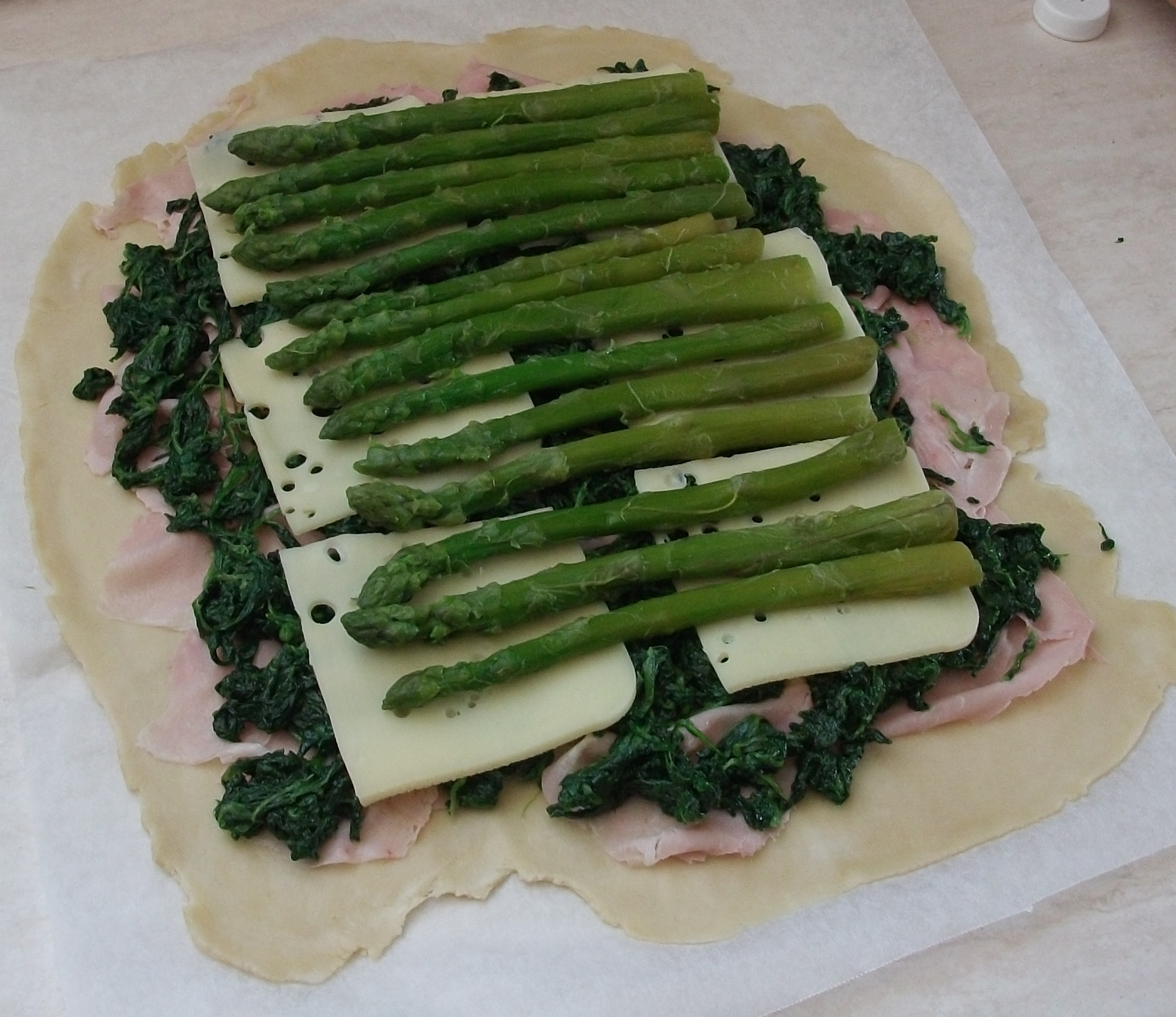 riprendete la pasta, stendetela con il mattarello su un foglio di carta forno.. dategli la forma rettangolare... stendervi pre prima il prosciutto cotto a fette.. poi gli spinaci l'emmenthal tagliato fine e infine gli asparagi messi uno accanto all'altro.