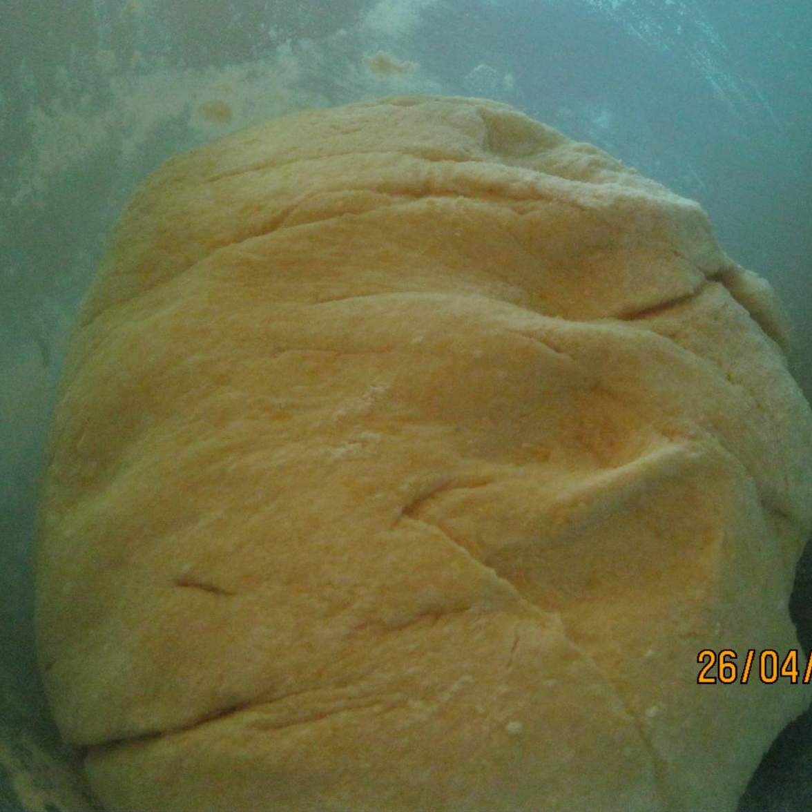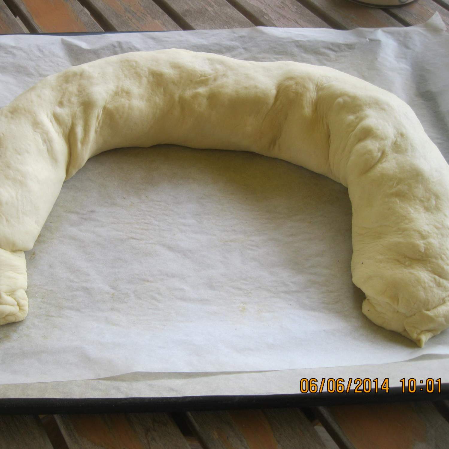 chiudere a cilindro fermando bene le estremità, adagiare sopra una teglia coperta da carta da forno.Fare lievitare coperto da un telo fino al raddoppio. Prima di infornare spennellare con un filo mdi olio, poi cuocere a forno preriscaldato a 180° per mezz'ora circa