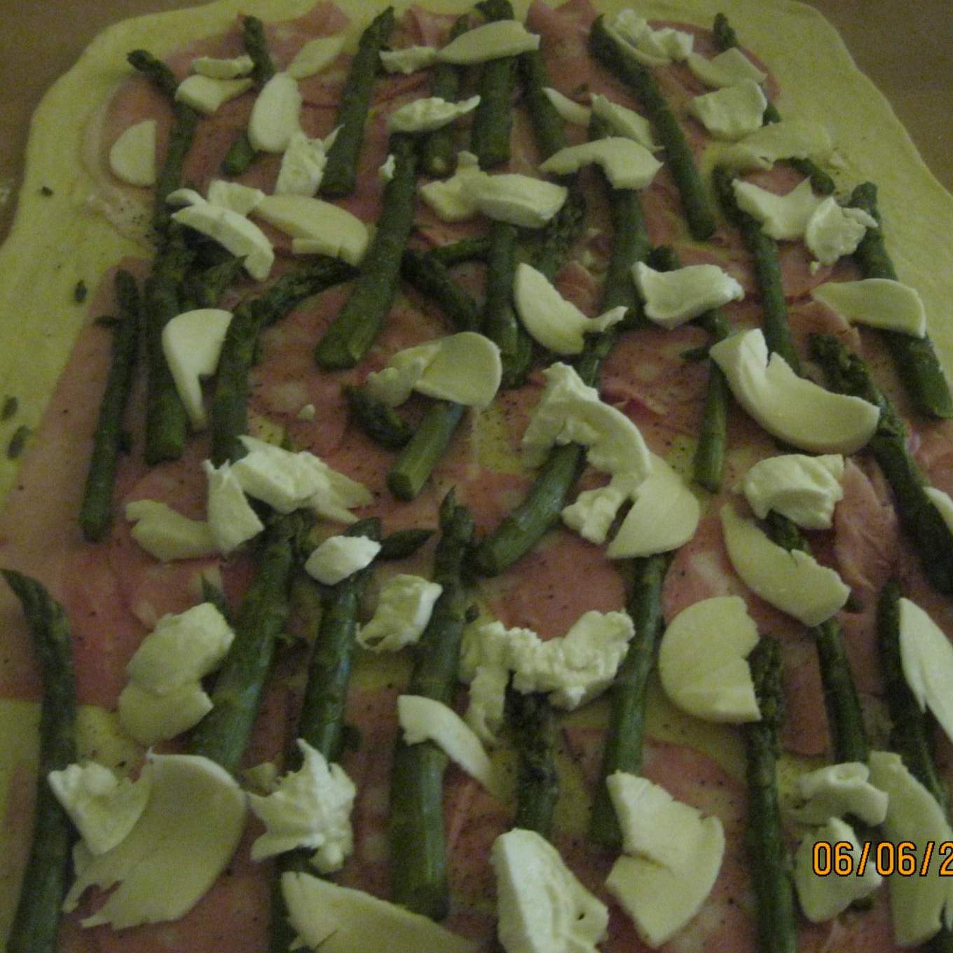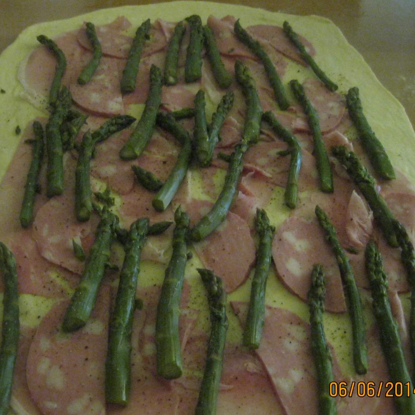 coprire con le fette di prosciutto e mortadella , allineare in fila gli asparagi