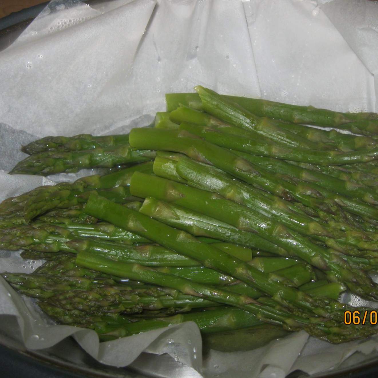 "coperchio chiuso" 1 litro di acqua , nell varoma coperto con carta da forno gli asparagi salare e cuocere per 20m a varoma vel 2. Toglierli e farli raffreddare.
