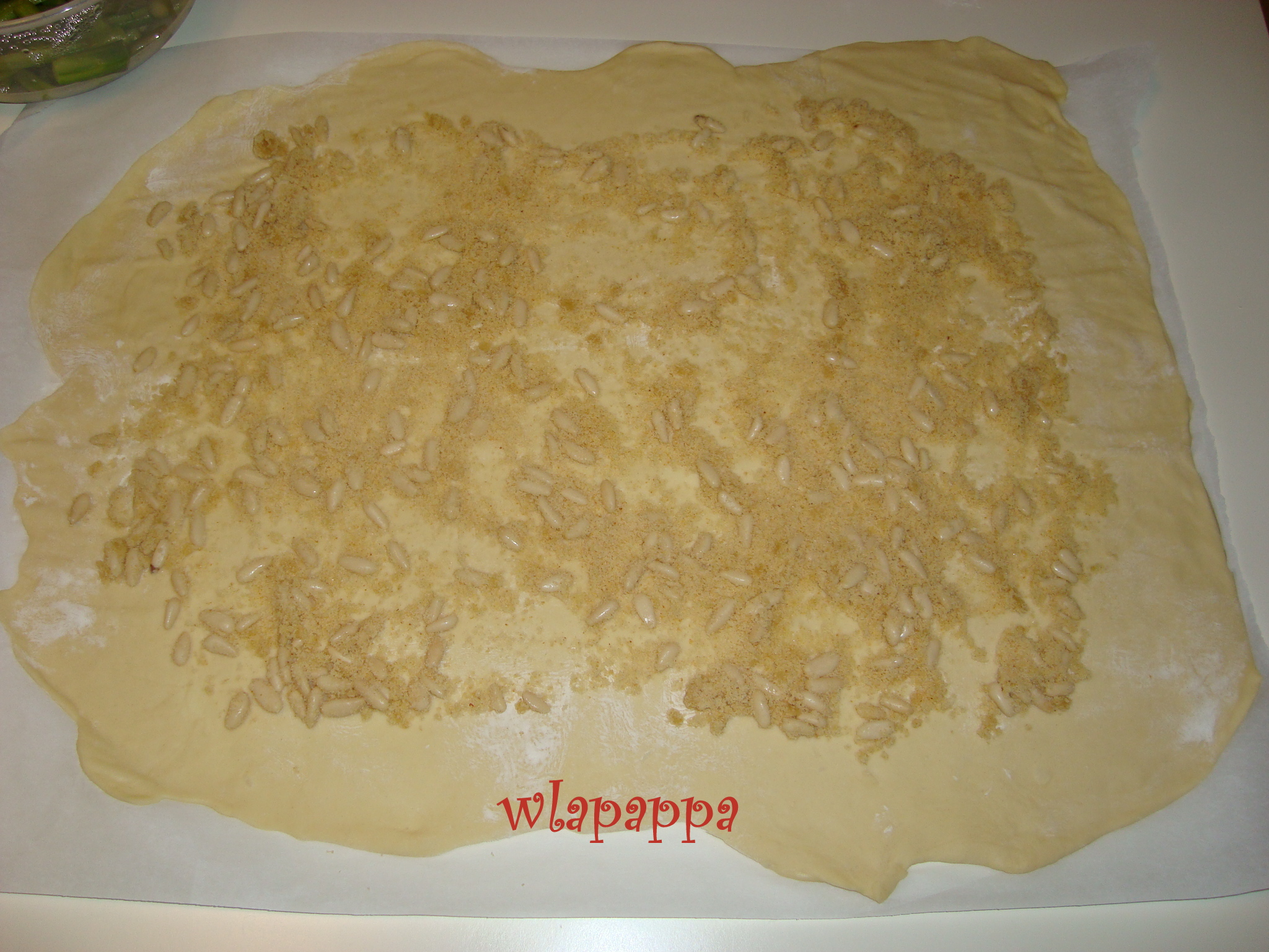 "velocità soft" Stendere la pasta tra due fogli di carta forno (se necessario infarinare un pochino) e tirare una sfoglia rettangolare sottile, spargere il pangrattato e pinoli, poi le fette di prosciutto e le fette di provola.