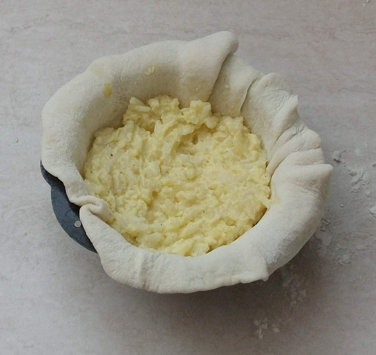 stendeteli con il matterello e con quello più grande foderate il fondo di una tortiera spennellato di olio , se è tonda circa 24 cm di diametro, altrimenti si può anche fare rettangolare. farcite la pasta con il composto di riso, ricoprite con il secondo disco di pasta , fissate i bordi e cuocete a 190° x 40 min circa.