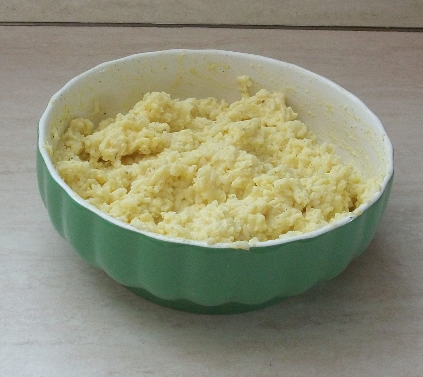 lavorate con una forchetta la ricotta riducendola in crema, aggiungete il riso, poi le uova sbattute , il pecorino e abbondante pepe (io uso quello nero) macinato. mescolate bene con un cucchiaio di legno.
