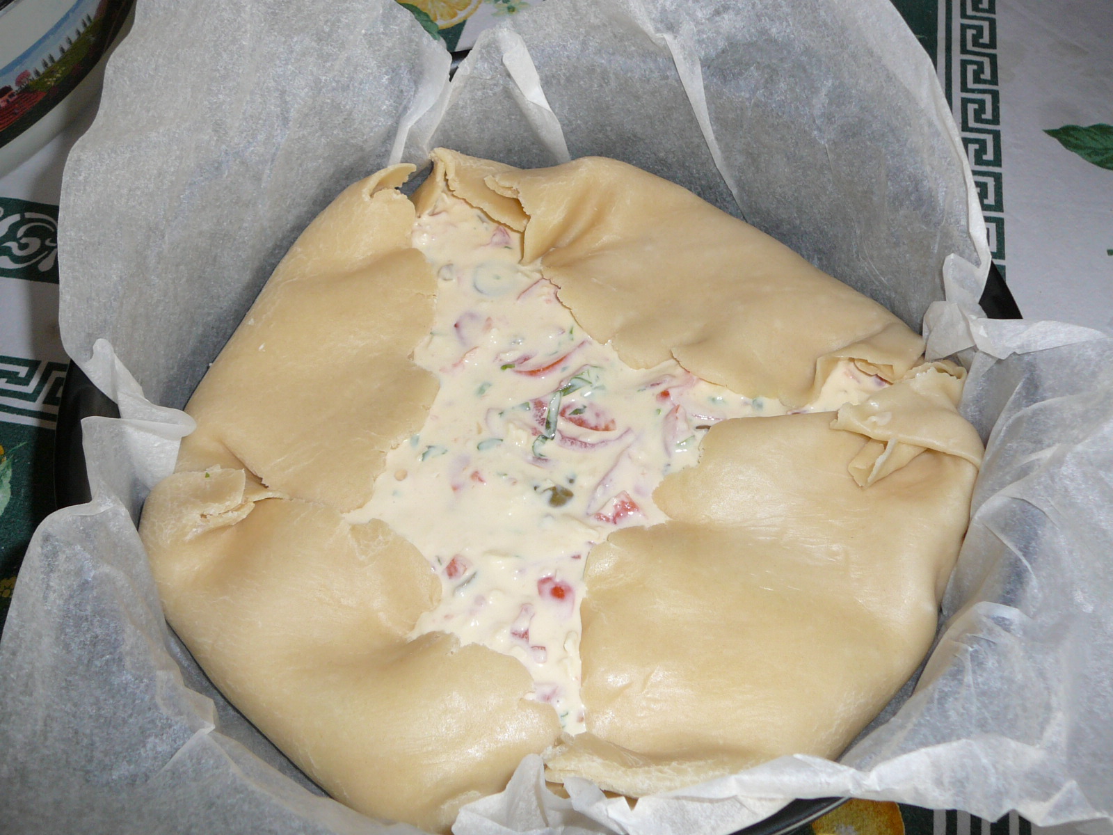 Versare il ripieno nella tortiera e spargere sopra il parmigiano reggiano, poi ripiegare i bordi di pasta sporgenti all'interno.