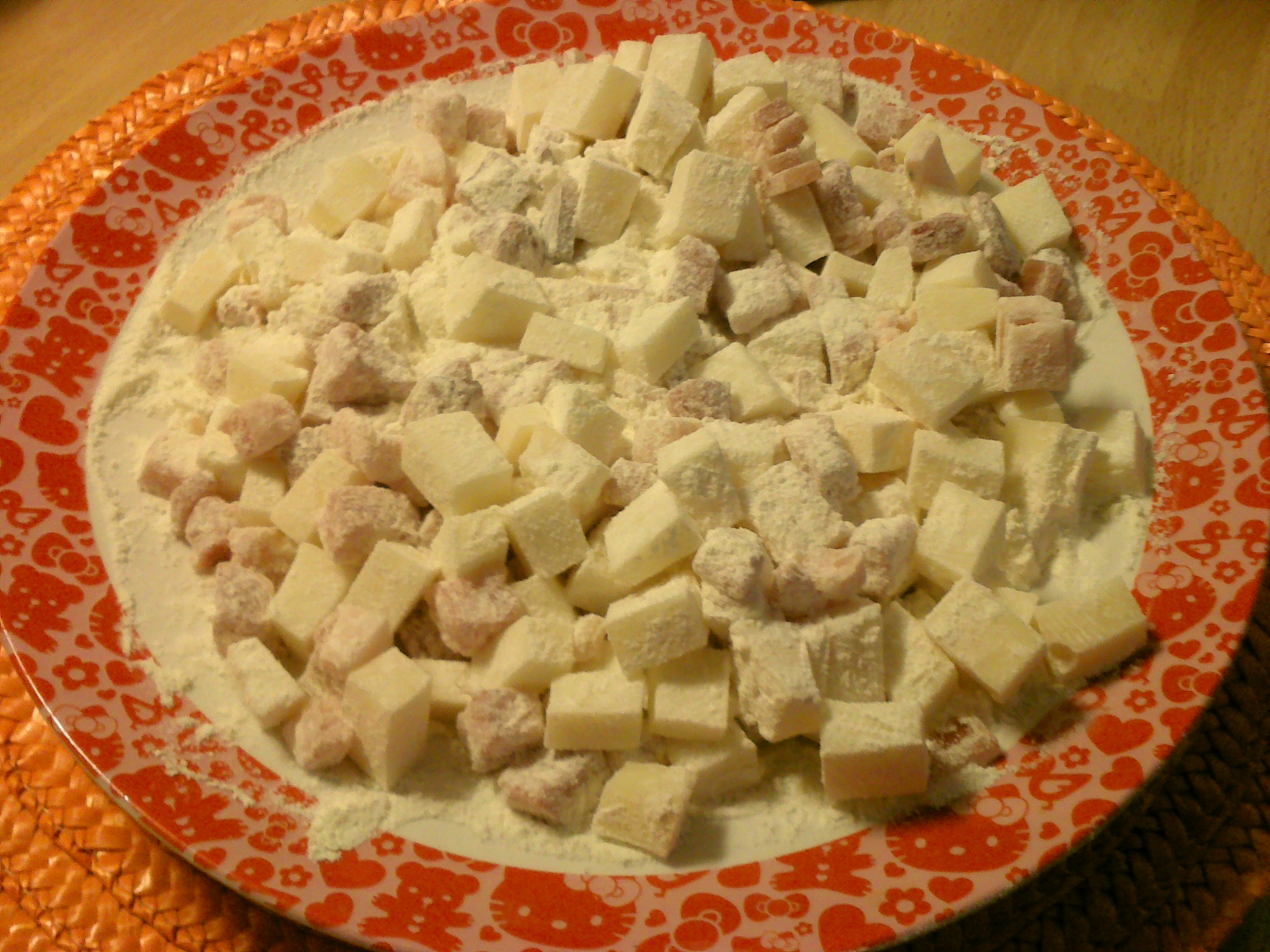 ciao verobella se posso darti un consiglio è inutile infarinare i cubetti basta che l' aggiungi all'impasto e lavora tutto l'insieme vedrai che si amalgama tutto e il risultato è uguale a quello delle foto ma risparmi molto tempo, ciao