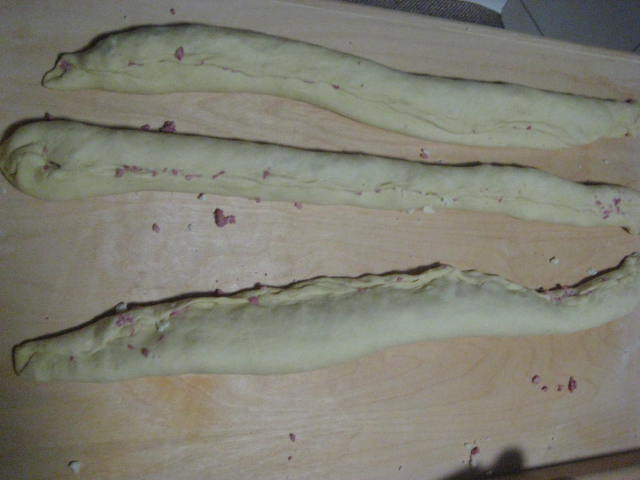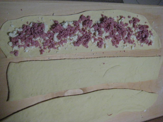 Quando l'impasto sarà lievitato, stenderlo col mattarello cercando di dargli una forma rettangolare; tagliare in 3 parti uguali in modo da ricavare 3 strisce e disporvi su ognuna il ripieno.