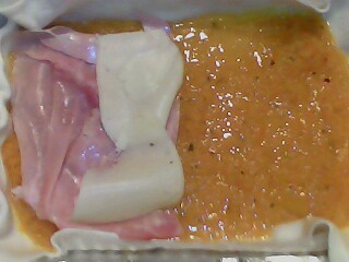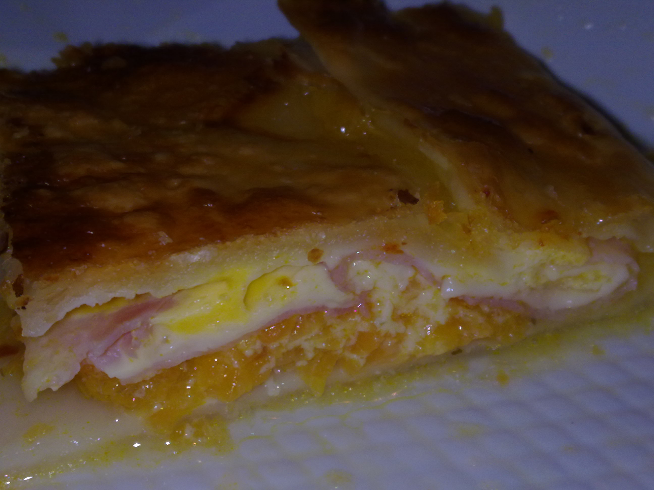 "coperchio chiuso" cuocere la zucca tagliata a cubetti con olio sale prezzemolo e aromi a piacerevel.1 100°, versare il composto nella teglia mettere uno strato di prosciutto e un uovo sbattuto e infornare. 5 minuti prima della cottura versare un filo di miele nella parte superiore della torta.180° per 30 minuti circa