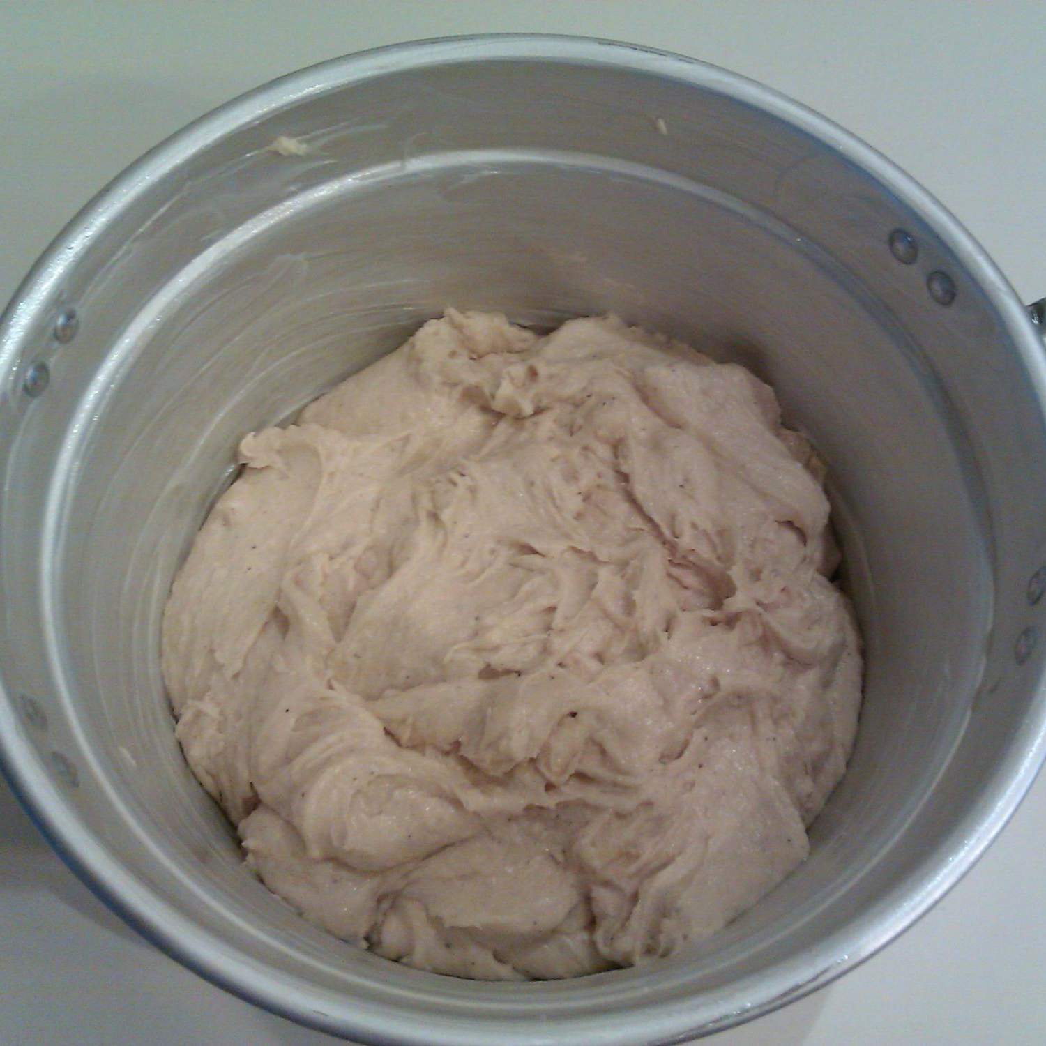 Ungete bene uno stampo di alluminio con lo strutto, mettere l’impasto e lasciare lievitare in un posto caldo fino al raddoppio dello stesso (circa 2 ore ma dipende dalla temperatura)