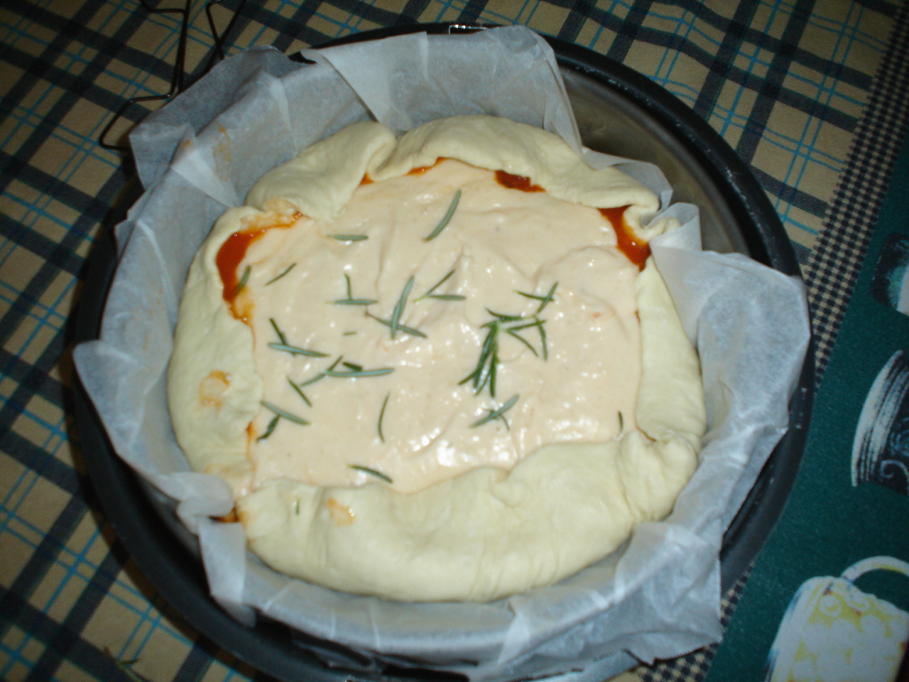 Mentre cuoce la besciamella, stendere la pasta fatta precedentemente riposare in frigo su un foglio di carta forno, fino ad uno spessore di 3-4 mm, rivestire una teglia di 26cm di diametro, bucherellare il fondo dell’impasto. Versare il pomodoro preparato e intiepidito e la besciamella “soda”.