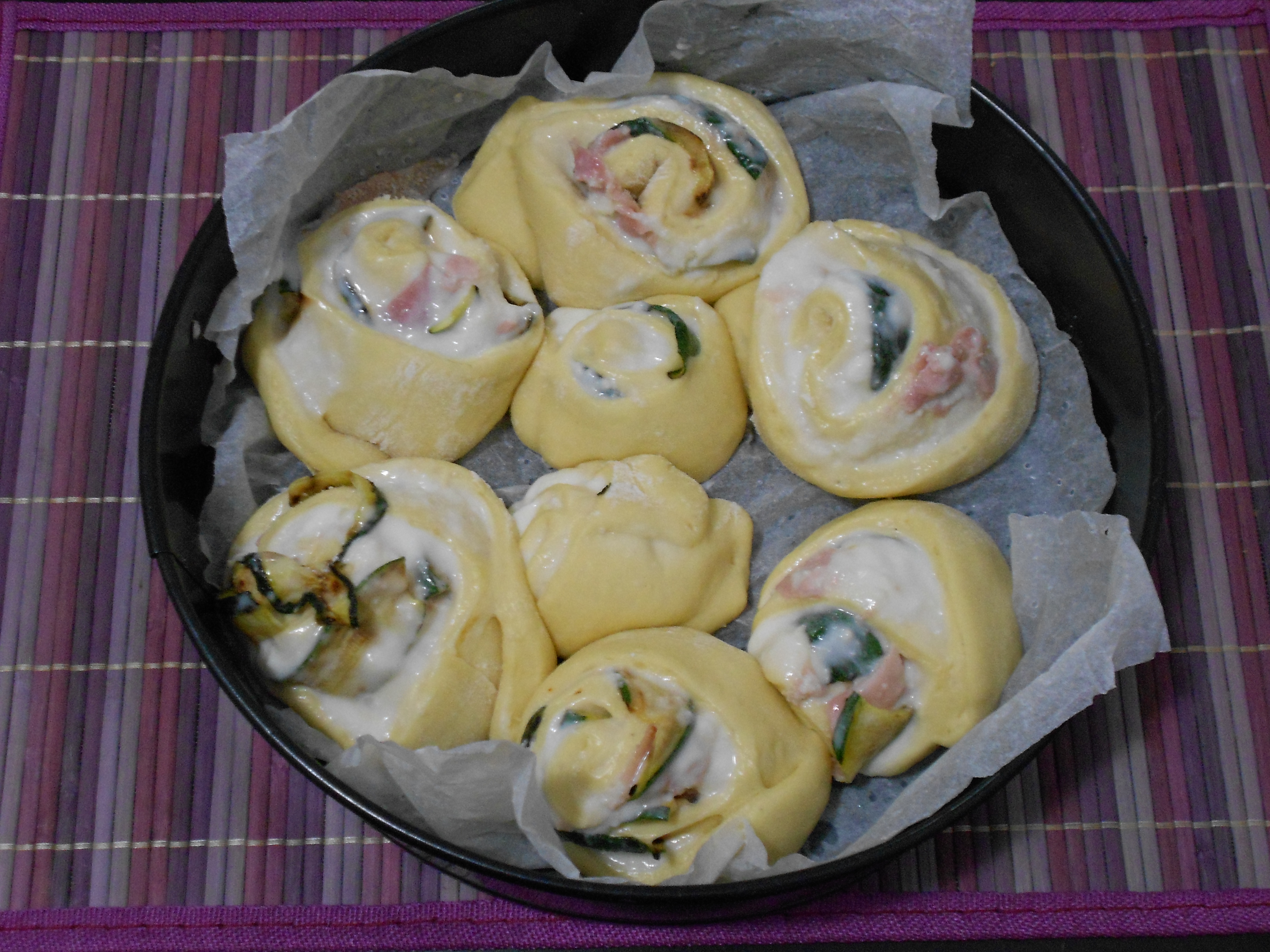 "coperchio chiuso" e stendero con il mattarello creando una sfoglia di circa 1cm, dopodichè riempire a piacere (si puo' mettere veramente di tutto!) io l'ho fatta con zucchine grigliate, crescenza e prosciutto cotto (svuotafrigo)!!! Una volta riempita, arrotolate la sfoglia su se stessa e tagliate dei pezzi di circa 4/5 cm l'uno, chiudeteli in fondo e posizionateli nella teglia di cottura, non troppo vicini perchè dovranno lievitare per almeno 1h! una volta lievitate le vostre ''roselline'' mettetele in forno a 180° per 40min, anche qualche minuto in più, se necessario.