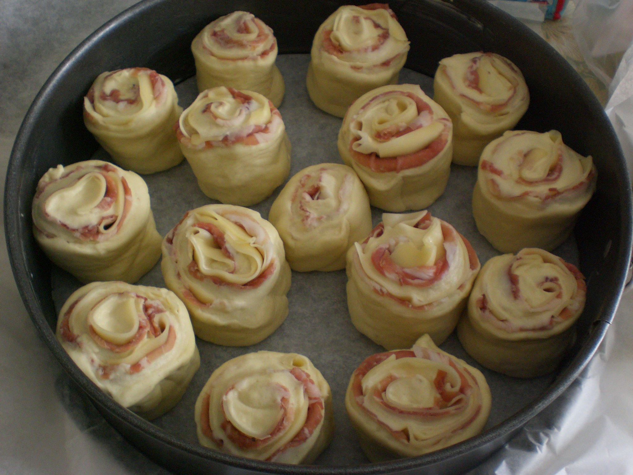 "velocità spiga" per 4-5 min. aggiungendo poco alla volta l'acqua, per ultimo aggiungere il sale. L'impasto deve risultare morbido e liscio, all'occorrenza aggiungere altra acqua. Coprire con un canovaccio e lasciare lievitare fino al raddoppio, i tempi di lievtiazione dipendono dalla forza della vs. pasta madre. Dopo la lievitazione riprendere l'impasto dividerlo in due parti e stendere ciascuna parte con il mattarello, farcire con pancetta e occhiato bavarese, arrotolare e tagliare dei cilindretti di circa 5 cm di diametro, chiudere alla base ciascun cilindretto e posizionarli in uno stampo rivestito di carta forno. Lasciare lievitare ancora e infornare in forno caldo a 180° per 35-40 min. La cottura dipende sempre dal vs. forno. Servire preferibilmente tiepida.Ovviamente si può sostituire il ripieno con quello che preferite!!!!