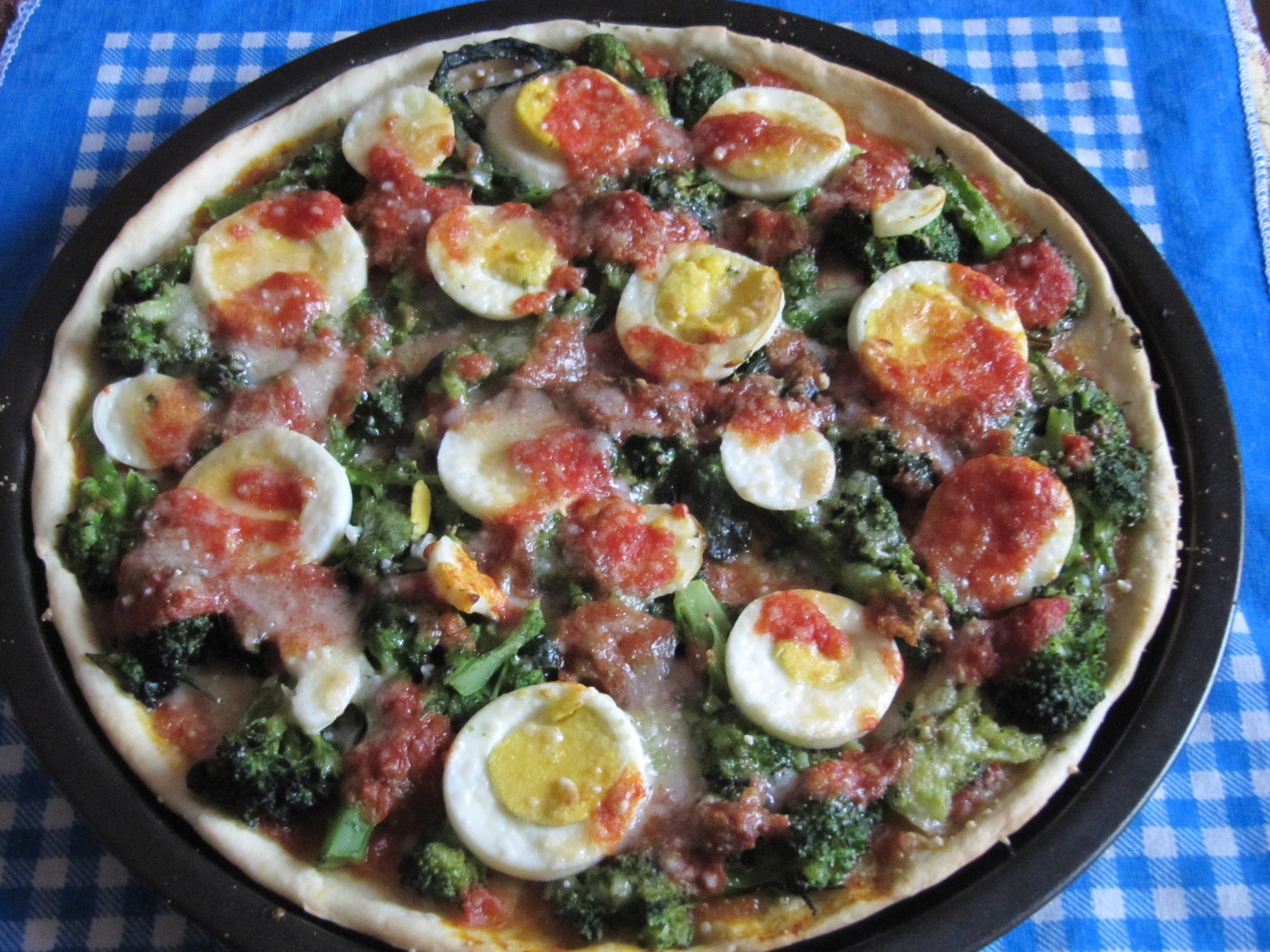 Trascorsi i 15 minuti, stendere la pasta in una teglia oleata, distribuirvi sopra alcune cucchiaiate di salsa o i pelati, i broccoletti, metà del pepato, qualche altra cucchiaiata di salsa, le uova sode a rondelle e il pepato rimasto.
