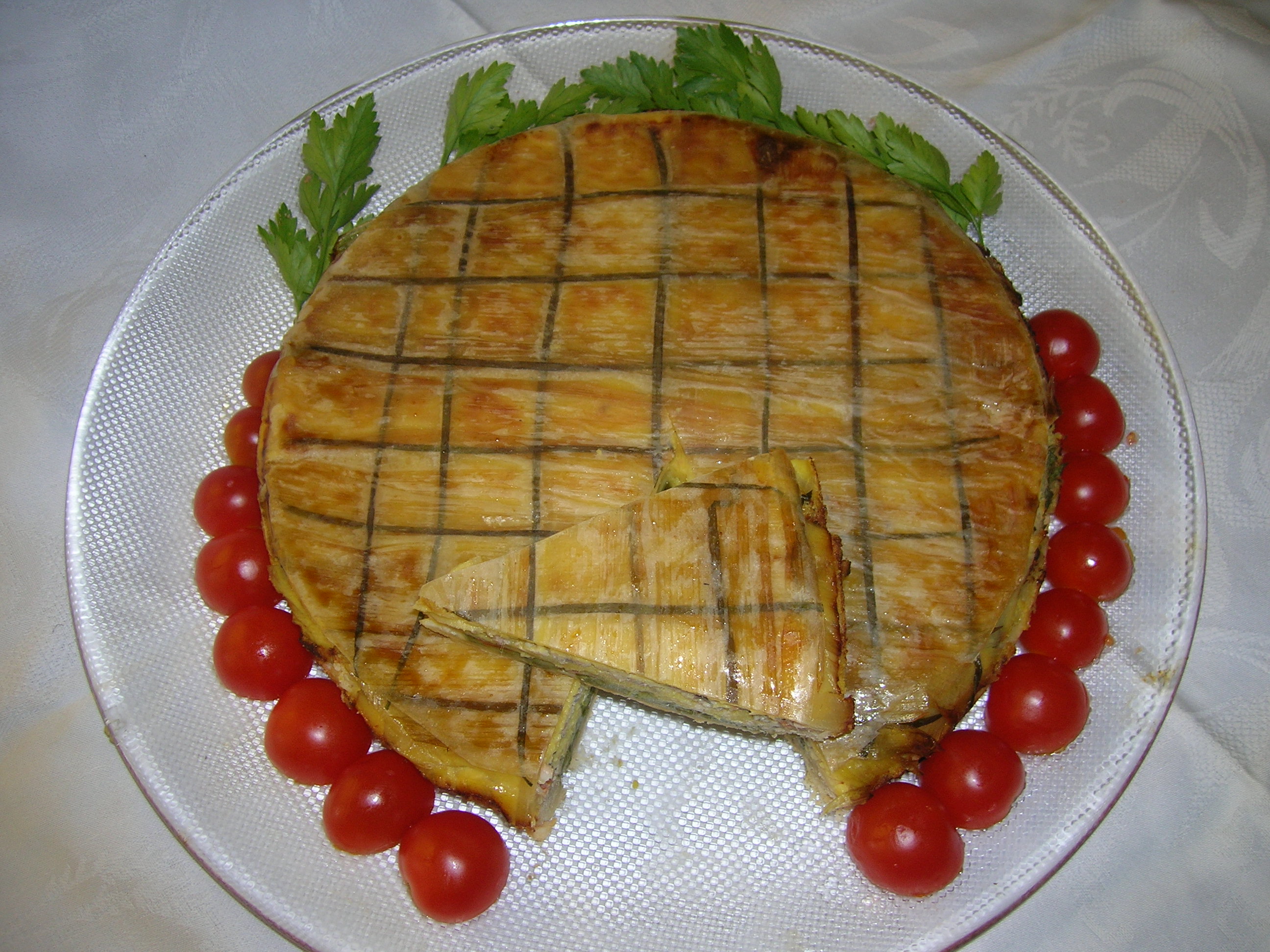 Preparazione del ripieno: Lavare, mondare le verdure, sbucciare le patate. Mettere nel cestello le patate a tocchetti. Eliminare la parte verde del porro e tagliarlo della lunghezza del vassoio del varoma. Nel vassoio disporre il porro inciso verticalmente per dividerne gli strati. Nel varoma mettere al centro gli asparagi su cataforno bagnata e strizzata, sui lati il peperone rosso e quello verde tagliati a striscioline. Coprire il tutto con cartalluminio. Versare nel boccale 500 gr di acqua, sale,aglio, maggiorana, pepe rosa, Malaga. Posizionare cestello e varoma completo, cuocere: 30 min. temp. Varoma vel. 4. Estrarre il cestello, svuotare il boccale, mettere la farfalla, le patate , l’olio al peperoncino, le uova e il pangrattato, amalgamare: 30 sec. vel. 4. Sul fondo della teglia da forno disporre in modo alternato le foglie di porri e l’erba cipollina (in modo da realizzare la trama della torta). Distribuire metà della purea e stendere le alici. Salare leggermente, quindi distribuire il 2° strato di purea e finire con i peperoni e gli asparagi.