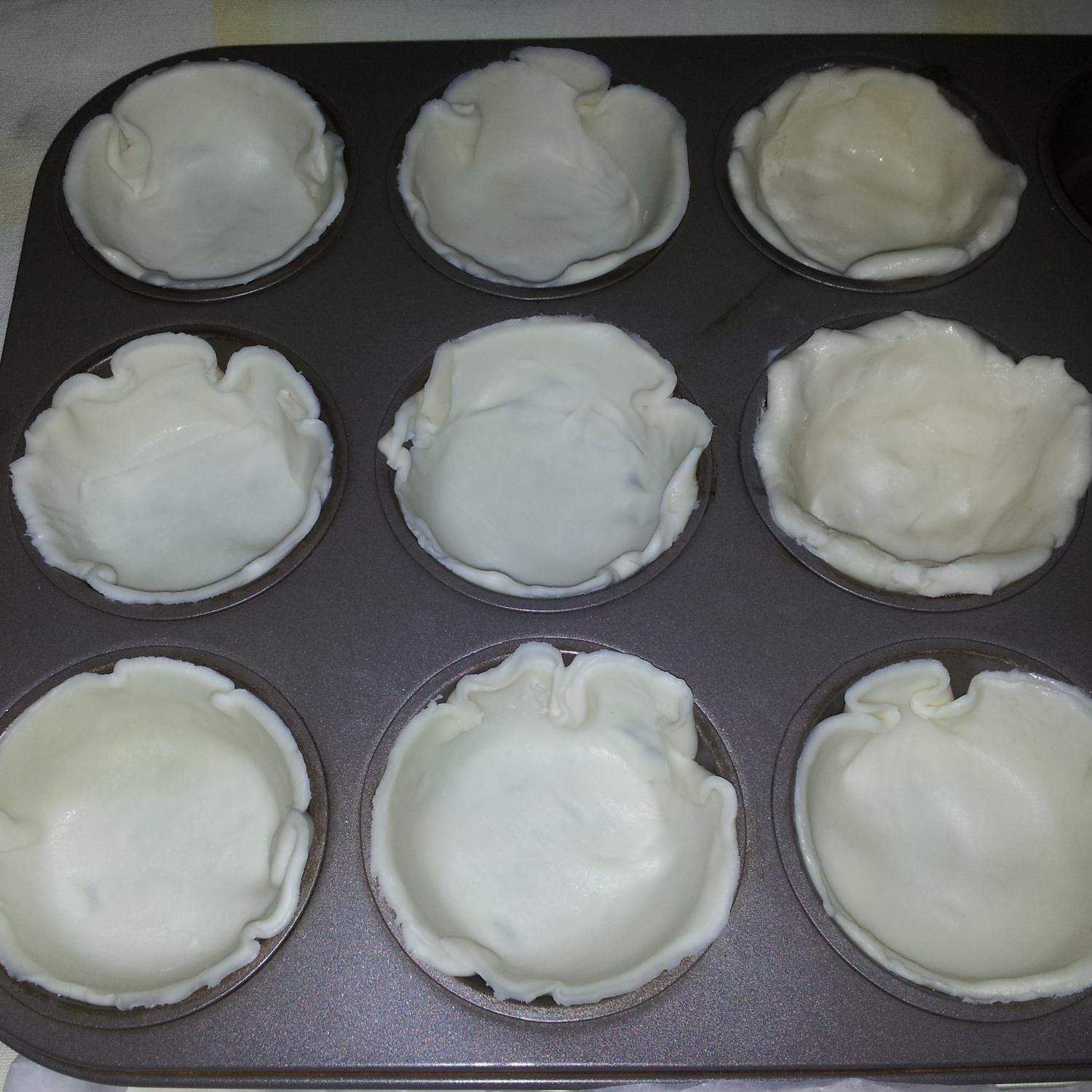 Una volta pronta e stesa sul piano da lavoro,ritagliare 11 cerchi con l'aiuto di un bicchiere largo piu o meno 10 cm. Prendere una teglia da muffin e inumidire con dell'olio gli stampini. Foderare gli stampini con la pasta e dare bene la forma. Mettere la teglia da parte per il momento.