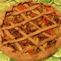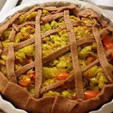 Stendere la pasta con il mattarello fino allo spessore di 2-3 mm, rivestire di pasta la teglia da forno e versarci il ripieno di verdure.