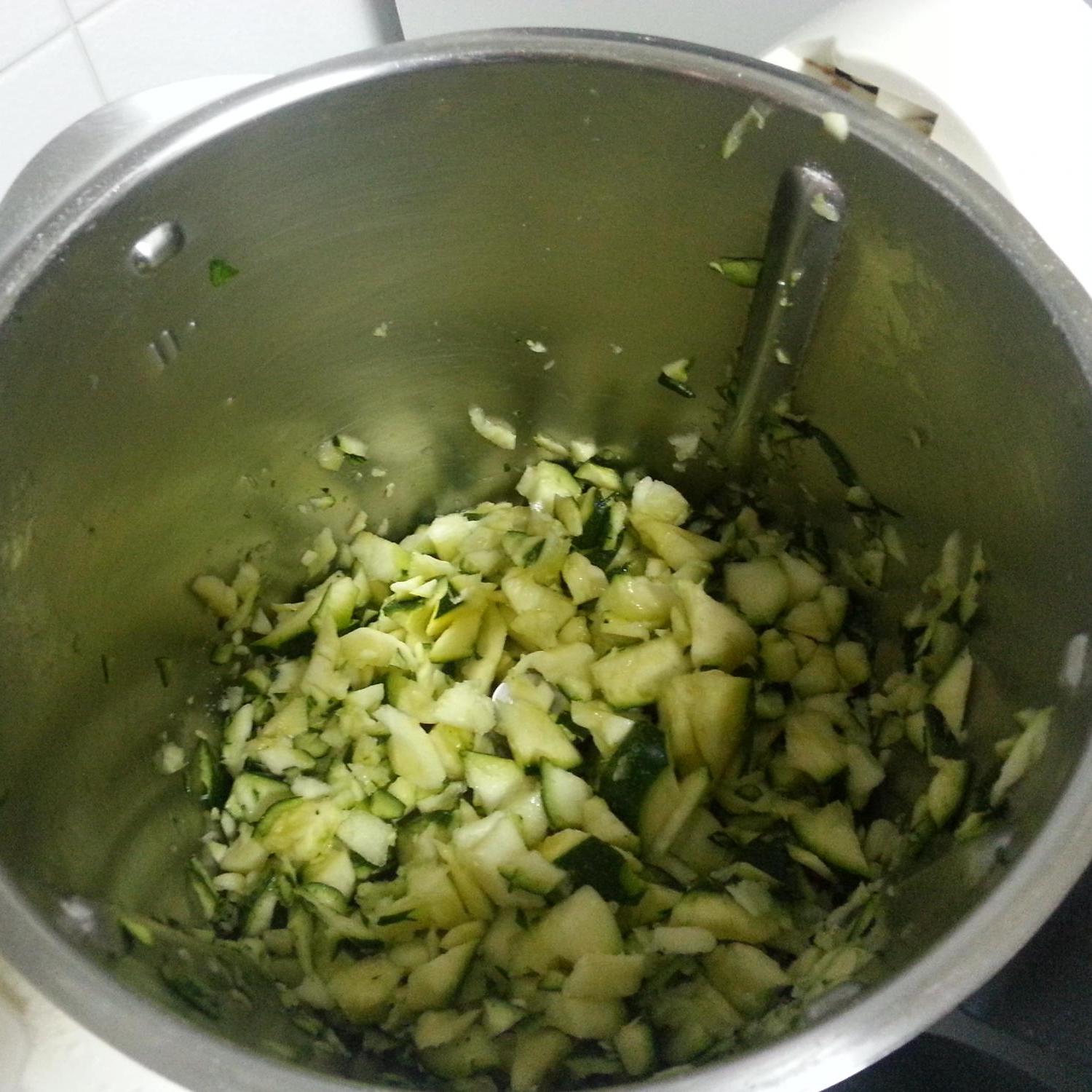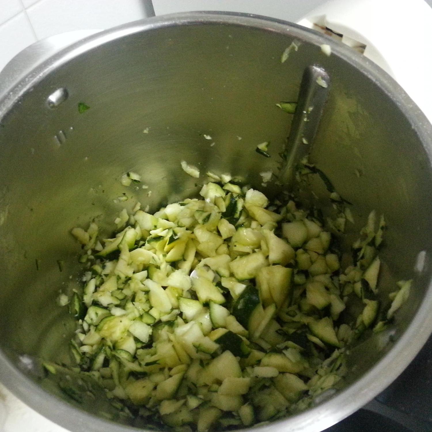 Mettere nel boccale le zucchine a pezzi e tritare grossolanamente 3 sec. vel.4. Aggiungere olio, sale e pancetta e cuocere 5 min.80° vel.1