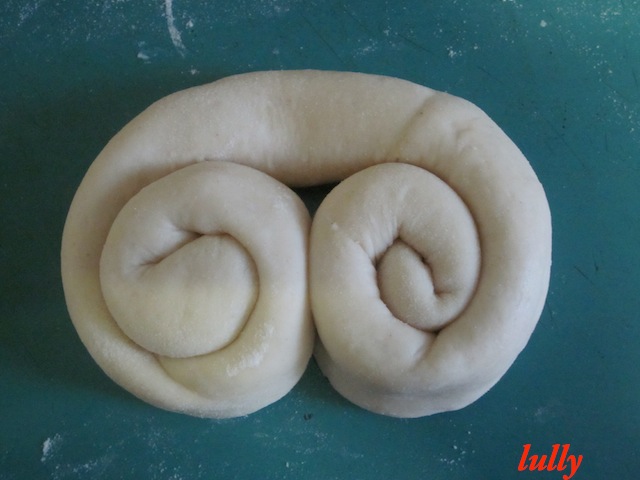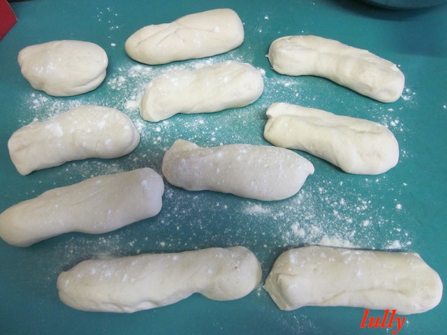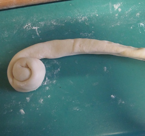 dopo la lievitazione riprendere la pasta e senza reimpastarla dividerla in 10 pezzi. stendere ogni pezzo in una striscia lunga circa 35-40 cm e larga circa 5 cm.