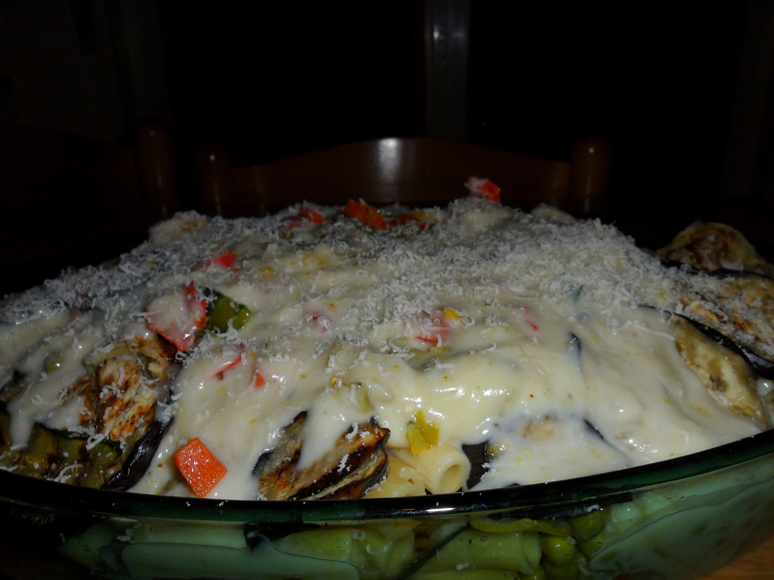 "coperchio chiuso" sempre senza lavarlo il latte di soia con la farina bianca e 20g di olio e.v.o rimasti....portate a 90° per 5' v.4 e fate la besciamella aggiungete liquido in base se la volete più o meno densa...e mettetela da parte...Stendete un primo strato di besciamella sul fondo della pirofila (ne ho usata una ovale in pirex)...poi fate uno strato di pasta, uno strato di verdure grigliate, uno strato di scamorza affumicata, uno strato delle verdure cotte nel