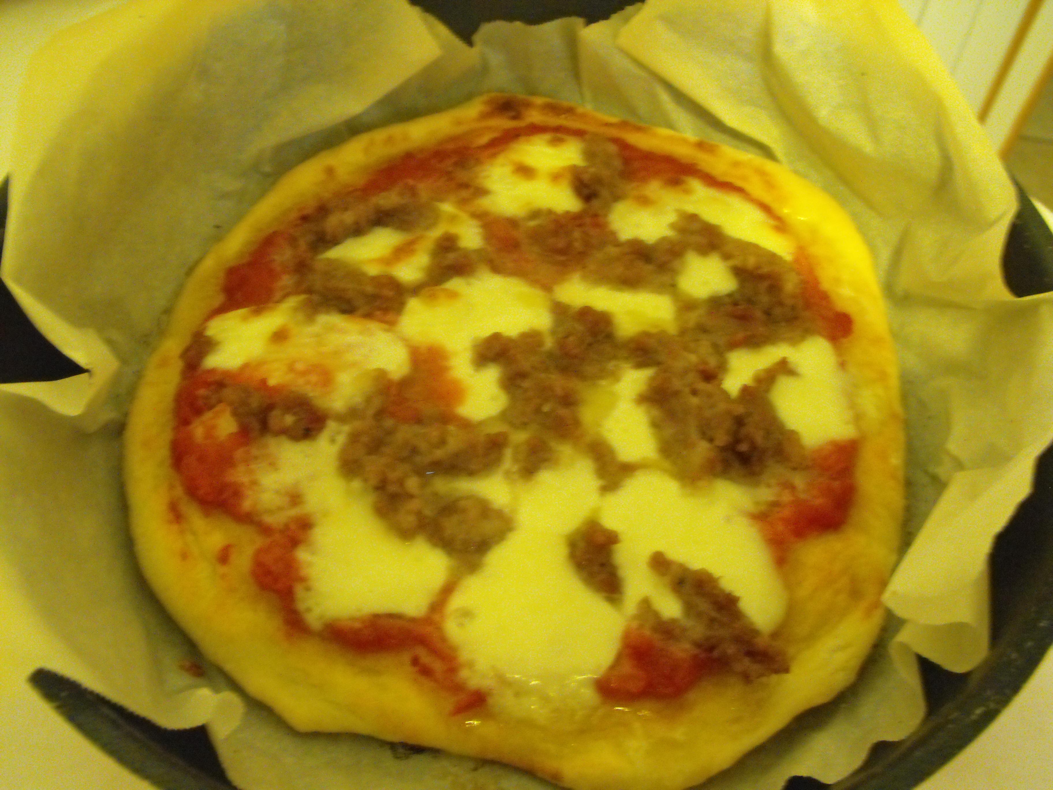 una pizza tonda con pomodoro,salsiccia,mozzarella