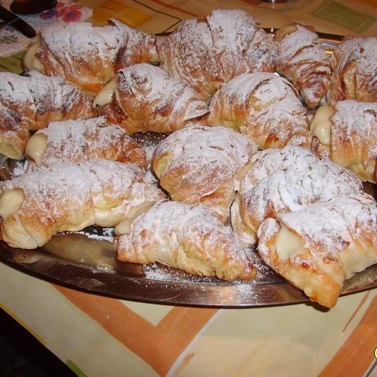 Quando le sfogliatelle saranno fredde prendiamo la crema pasticciera (fredda) e la inseriamo all'interno con una sacca a poche.. e infine spolverizziamo dello zucchero a velo per concludere la decorazione