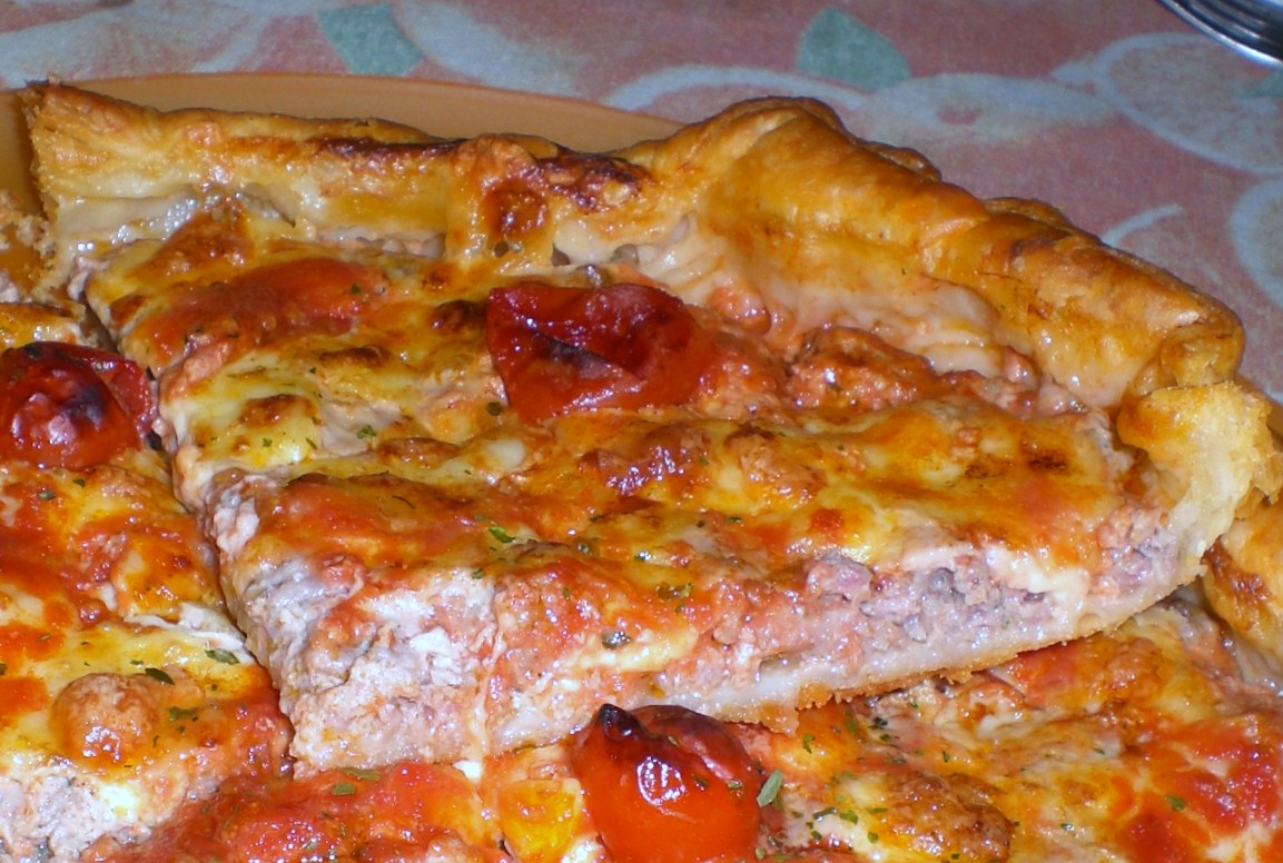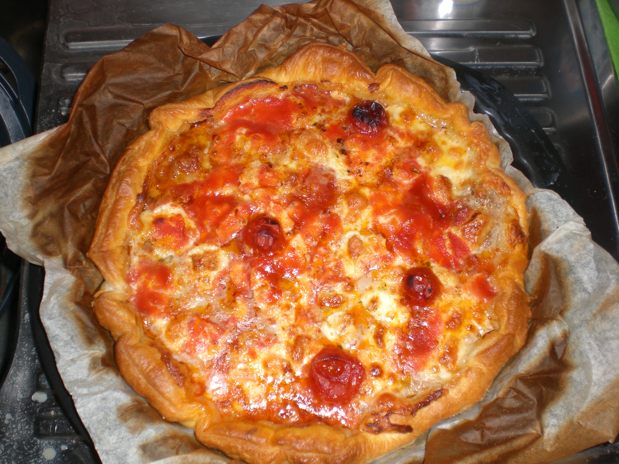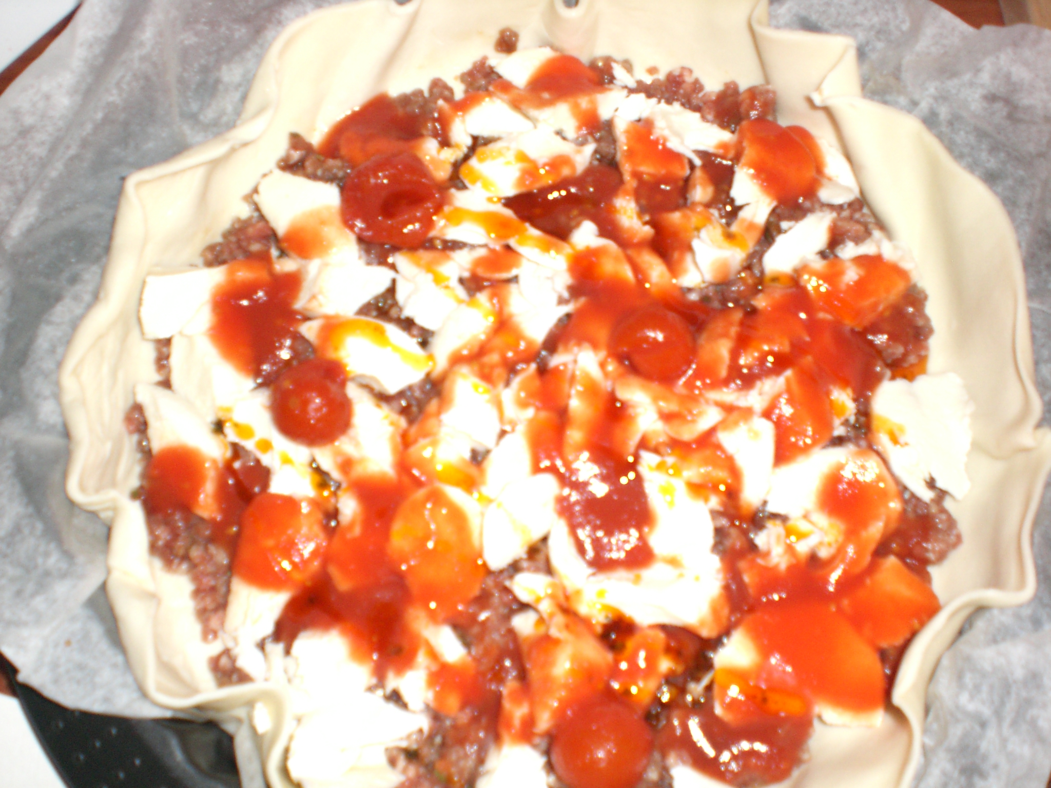 1. stendere la pasta su una teglia, nelcoperchio chiuso"coperchio chiuso" mettere a vel. velocità spiga"velocità spiga" il tritato con le uova, con il composto formare uno strato di carne sul fondo della pasta sfoglia, poi mettere a cubetti la mozzarella e in fine la salsa,