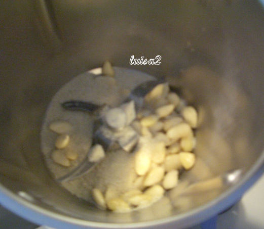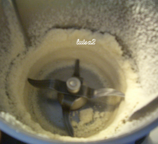 Frullare le mandorle con lo zucchero: 30 sec da vel 6 a vel 8, togliere e mettere in una ciotola