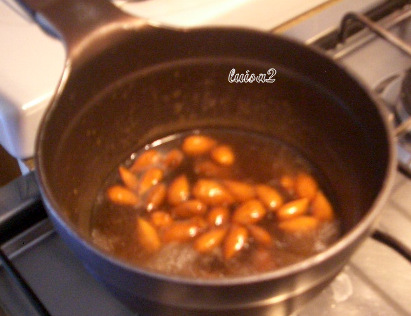 Portare ad ebollizione l'acqua in un pentolino e scottare le mandorle, scolarne poche alla volta, metterle su di un foglio di carta da cucina e spelarle