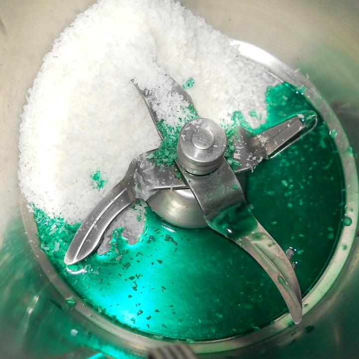 "coperchio chiuso" inserite 50 grammi di farina di cocco e il primo colorante alimentare mescolate iltutto per 10 Sec Vel 3 e poi mettere da parte su carta forno