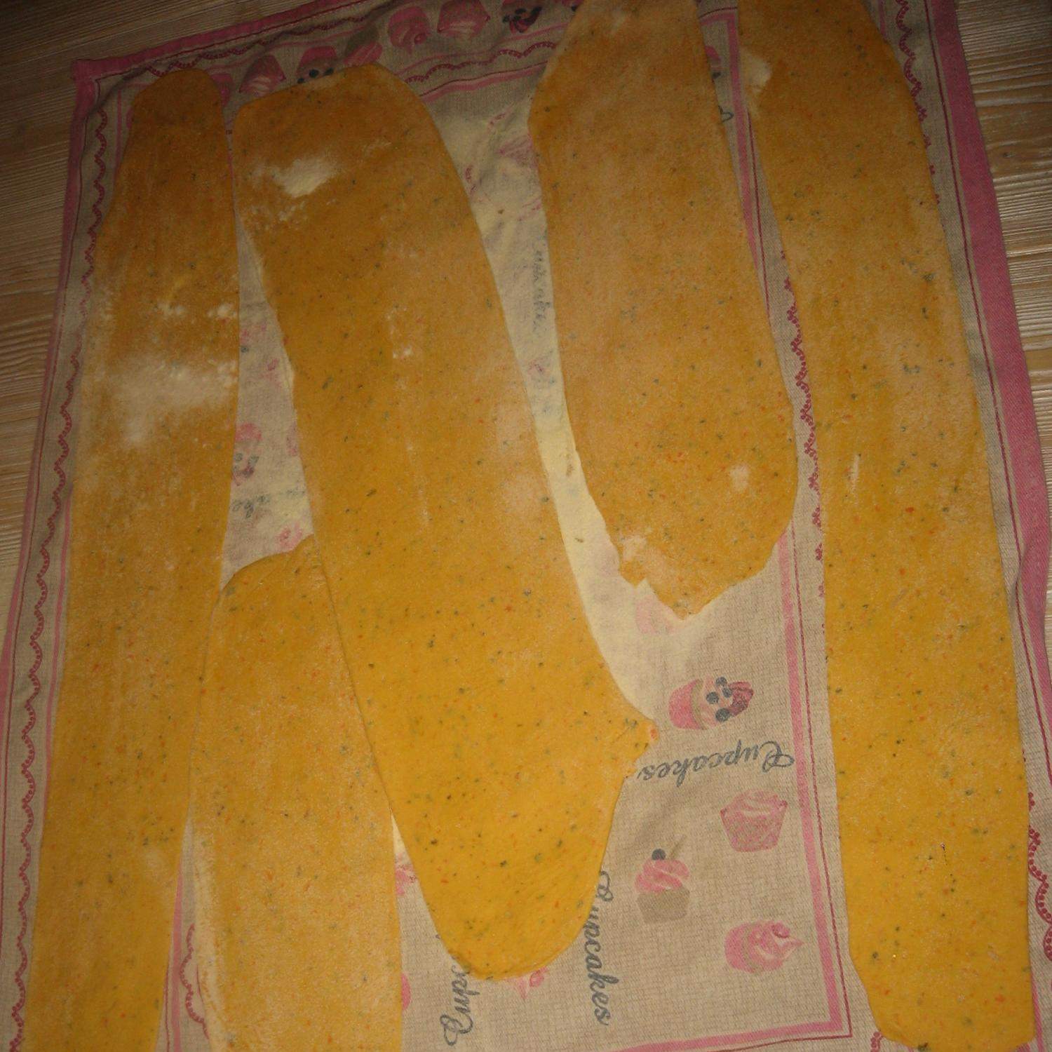 Dividere l`impasto in vari pezzi e infarinare con la rimacinata e,stendere con la macchinetta sfogliatrice fino alla misura n5 di spessore e, poi dare la forma che piu` vi piace, aiutandovi con un canovaccio infarinato mettendola bella stesa (io ho fatto le fetuccine).