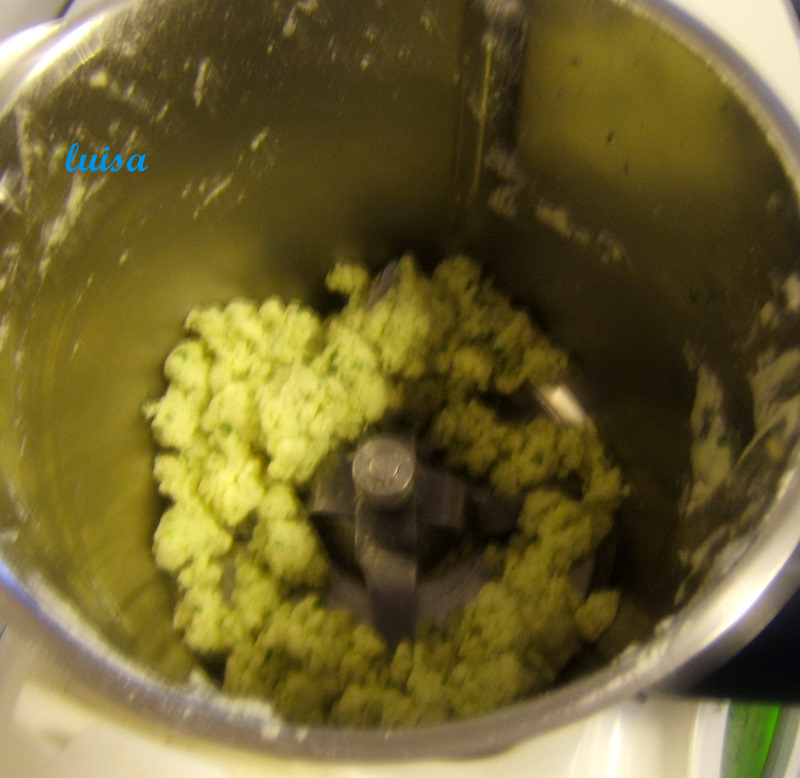 "coperchio chiuso" gli aromi e 30 g di semola presa dai 100, frullare: 15 sec vel 7aggiungere la rimanente semola (g 70) il parmigiano e l'acqua: 1 min vel
