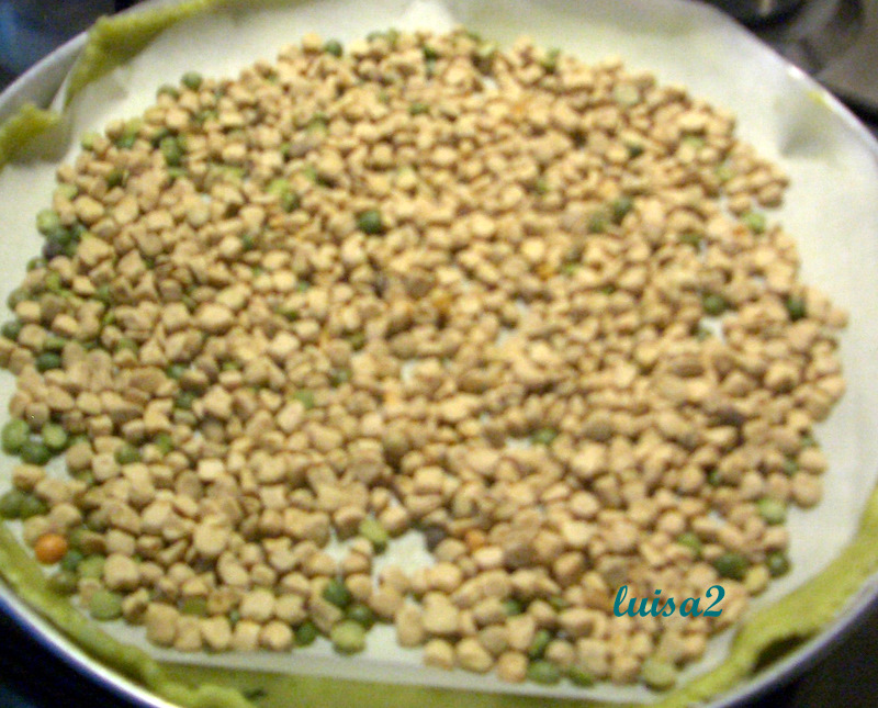 bucherellare il fondo con i rebbi della forchetta, coprire la pasta con il secondo foglio di carta da forno e riepite con i fagioli secchi. Cuocere in forno caldo 200° per 15 min, togliere la carta e i fagioli e rimettere in forno per altri 8-10 min