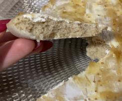 Nella foto è farcito con un velo di formaggio fresco spalmabile e un velo di marmellata di fichi.