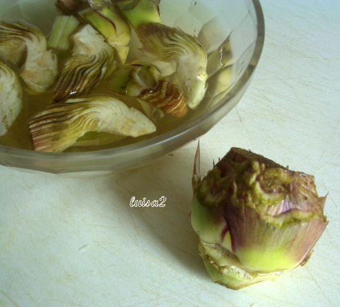 Preparare i carciofi a spicchi e l'interno dei gambi e metterli in una ciotola con acqua acidulata con succo di limone (io uso acqua gasata fredda)