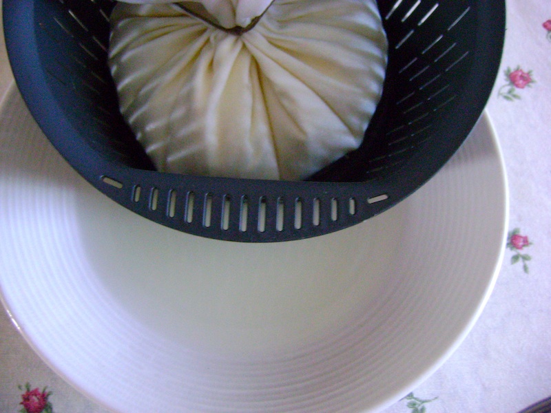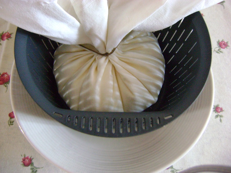 Lasciate il sacchetto a scolare per una notte sistemandolo dentro il cestello del bimby e ponete sotto il cestello un piatto per raccogliere il siero.
