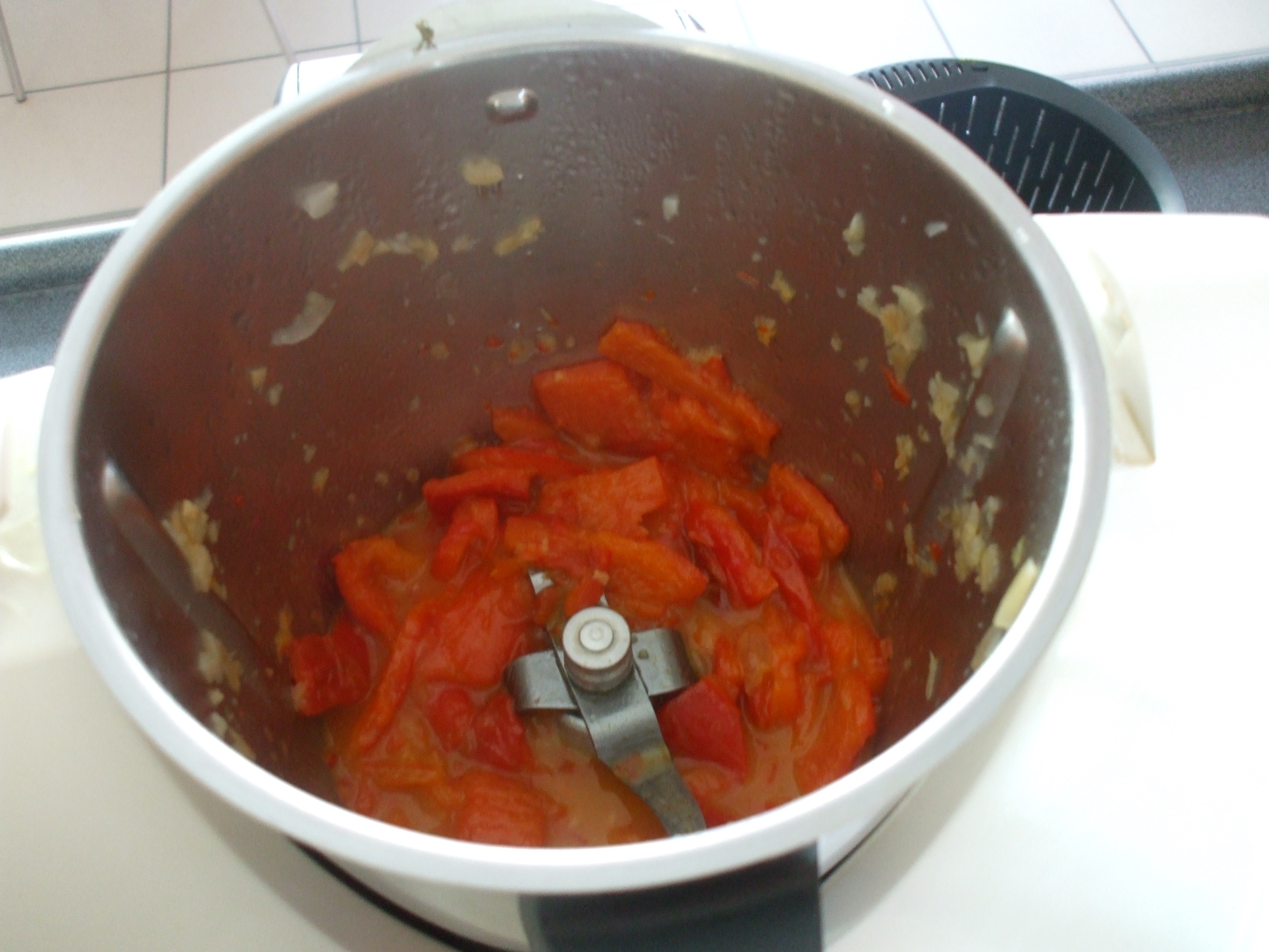 Aggiungere i peperoni, l'acqua, salare e pepare, cuocere: 20/25 min./100°/vel. 2.