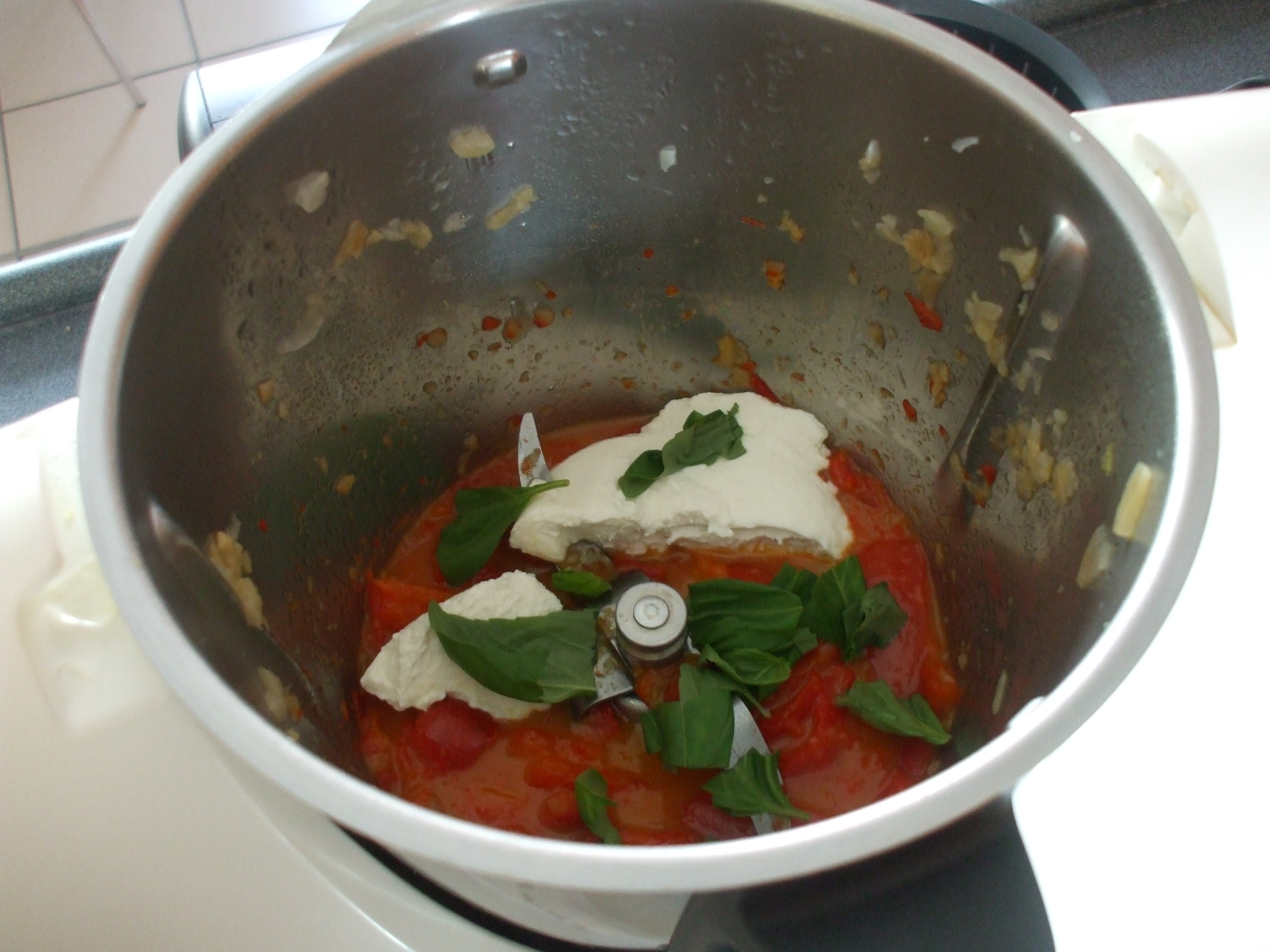 Al termine aggiungere la ricotta e il basilico, tritare: 5 sec./vel. 5 poi 10 sec./ vel. 10.