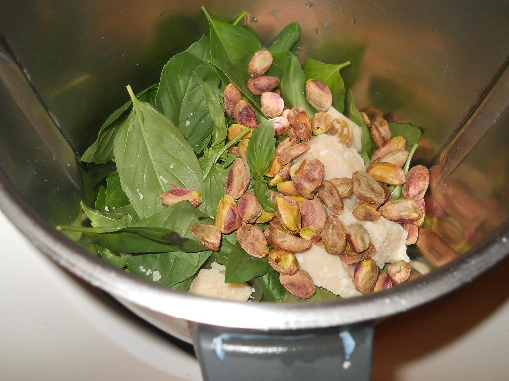 "coperchio chiuso" inserire parmigiano a pezzi pistacchi e tritare il tutto per 20 Sec Vel 6/7 Ora con la spatola riunite bene il trito e poi aggingere olio e sale ed emulsionate il tutto 20 Sec Vel 4 a questo punto traserite il nostro finto pesto pistacchioso in un barattolo di vetro e conservare in frigor come un classico pesto P.s. per una migliore pesto e' importante che le foglie di basilico non siano sciupate fresco e ben asciuute