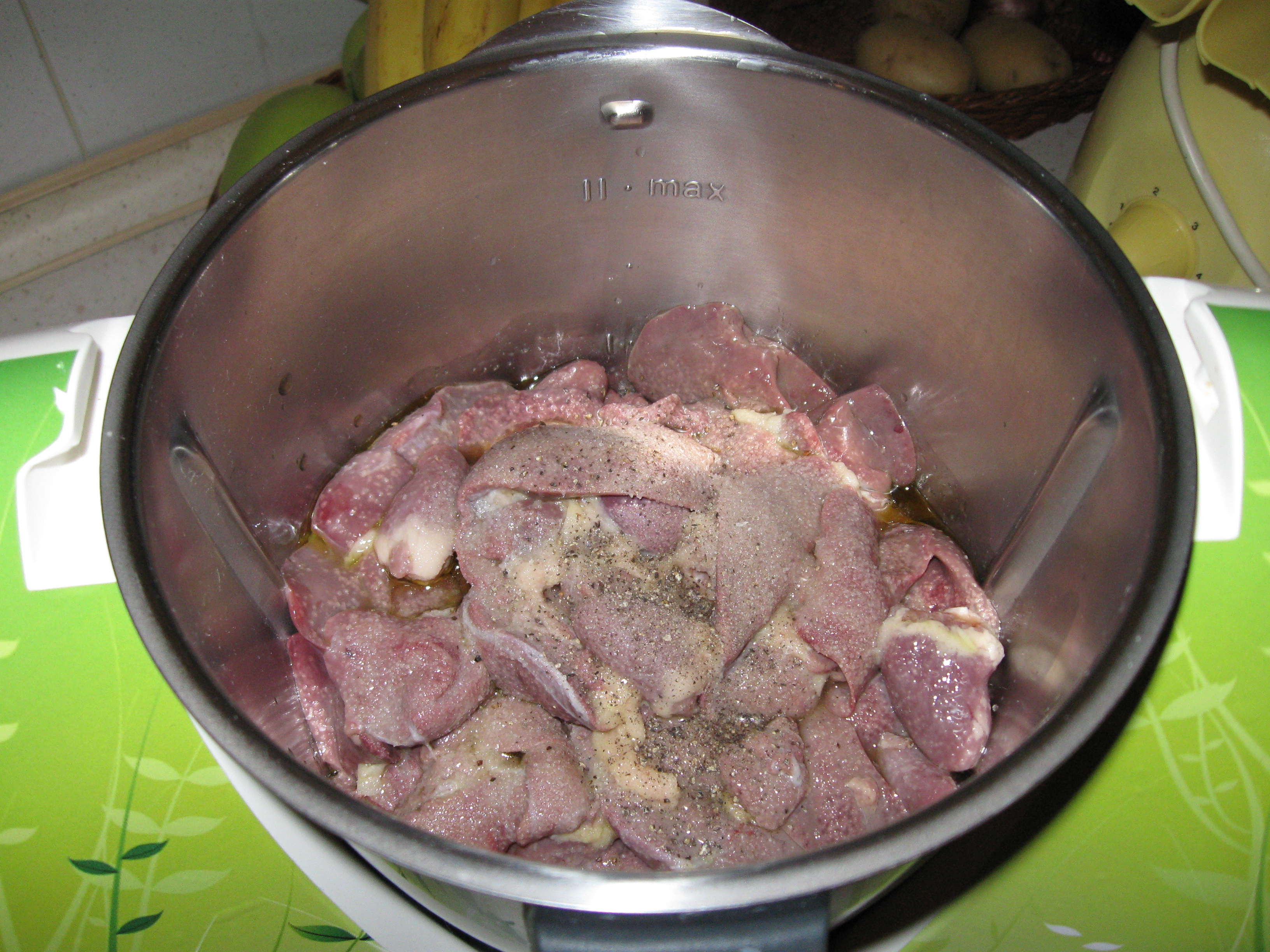 Mettere tutti gli odori a pezzi nel bicchiere, aggiungere poi i fegatini ben lavati, l'olio 1/2 bicchiere d'aceto sale e pepe; cuocere per 15minuti