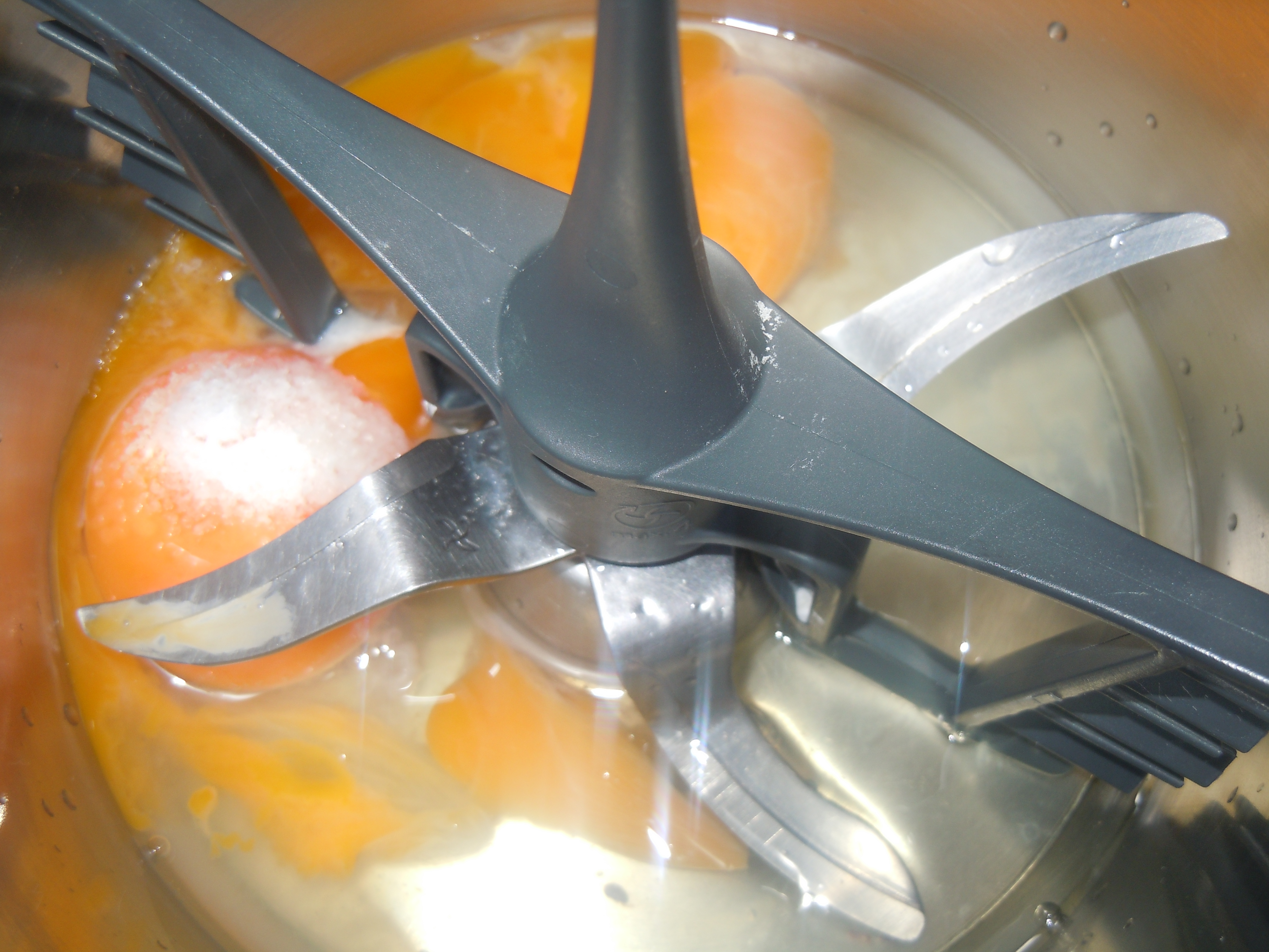 "coperchio chiuso" le uova, il sale ed il succo di limone: 45 sec. Vel. 5Col coperchio chiuso ed il misurino messo al contrario, versare sul coperchio l’olio in modo che scenda a filo dalle scanalature del misurino: Vel. 5 fino ad esaurimento dell’olio.