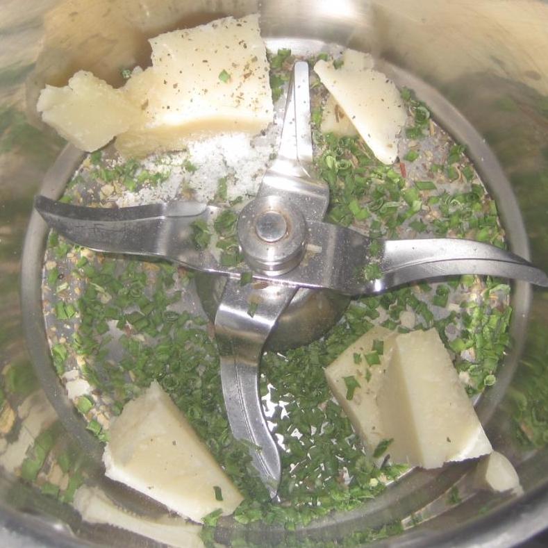 1. Inserire nel coperchio chiuso"coperchio chiuso" il formaggio, la salvia, l'erba cipollina e tritare 20 secondi velocità 8.