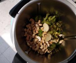 "coperchio chiuso" i broccoletti tagliati e puliti precedentemente cotti a vapore nel varoma (15 min temp varoma vel 1 con 1/2 litro d'acqua), gli anacardi, lo spicchio d'aglio tagliato in due. Tritare 30 sec vel 7. Riunire sul fondo con la spatola. Aggiungere l'olio evo e il sale e mescolare per 20 sec vel 4. Trasferire il pesto in 1 o 2 vasetti.