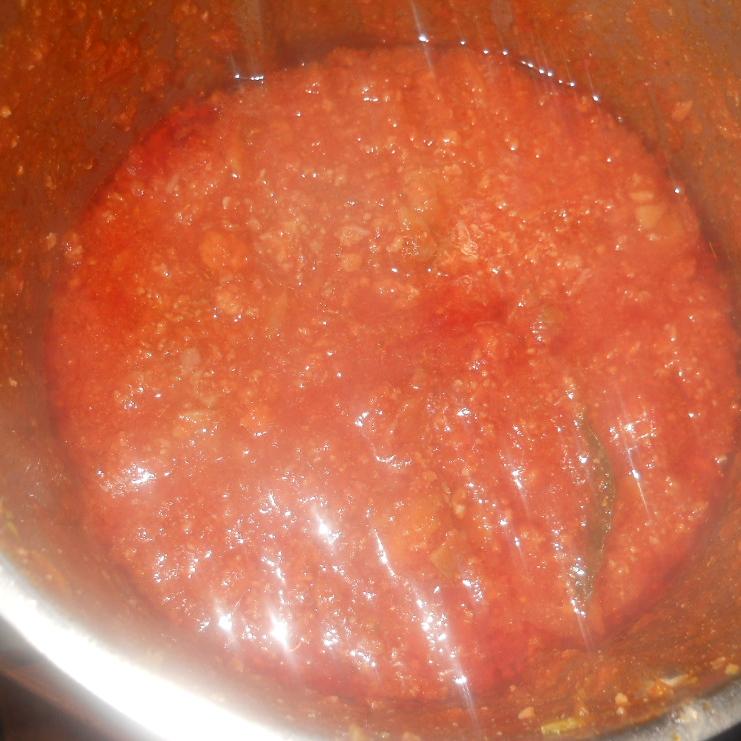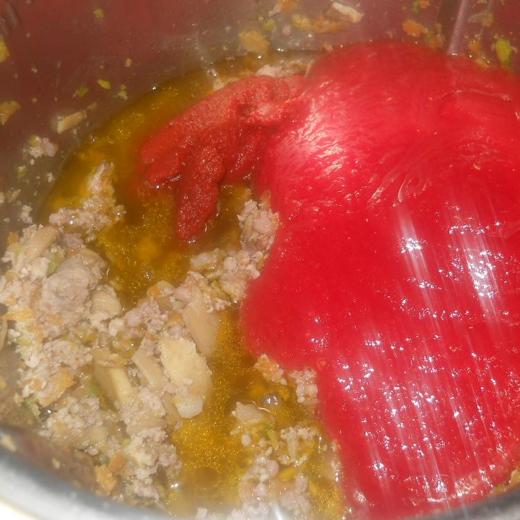 3. A questo punto unite la passata di pomodoro l' acqua concentrato di pomodoro alle verdure alloro, salate e cuocete il tutto per 30 /35 Minuti