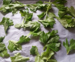 - Una volta che il sedano è lavato e asciutto le foglie le potete disporre su placca forno con carta forno