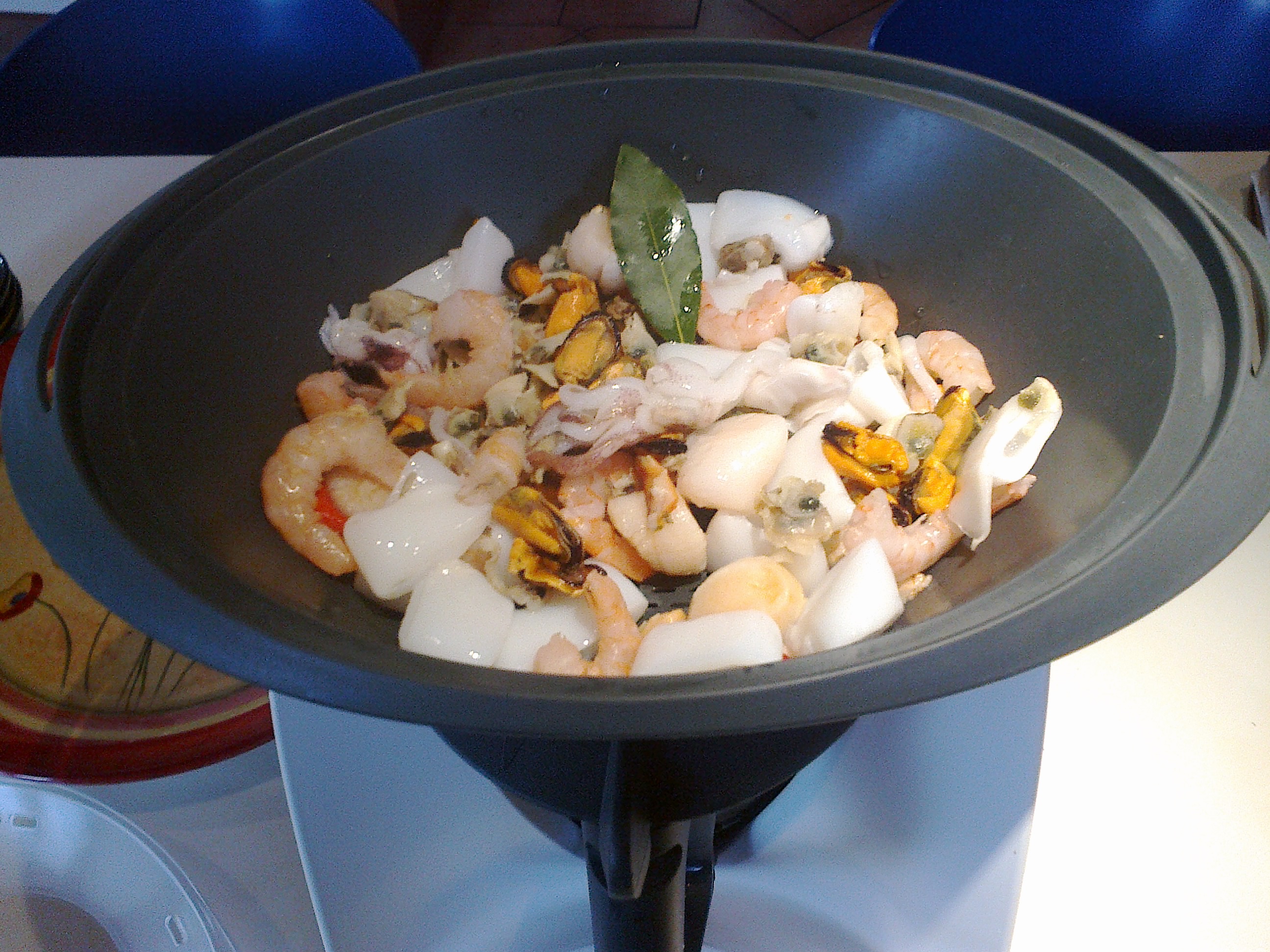 -Pulire e tagliare a tocchetti il pesce e sistemarlo nel varoma con 1 foglia di alloro.