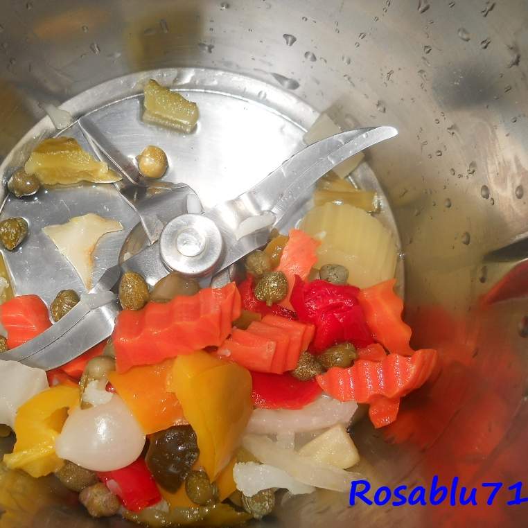 Per prima cosa vate i sottaceti e i capperi sotto acqua corrente per toglire in eccesso l'aceto scuolatelio bene e inseritreli nel