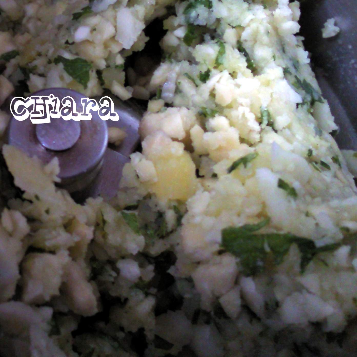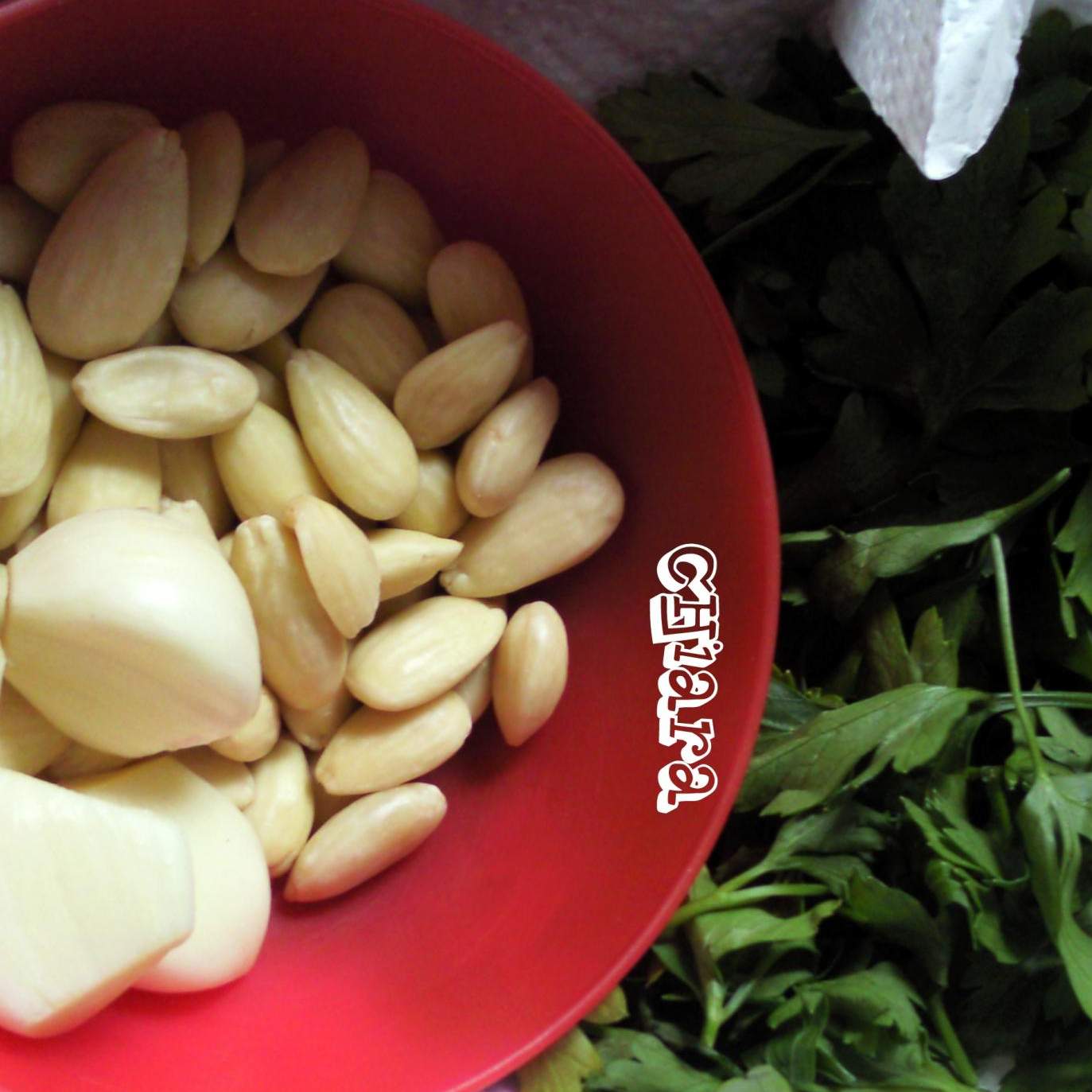 Mettere nel boccale aglio, prezzemolo, mandorle e patata: 5'' vel 6.