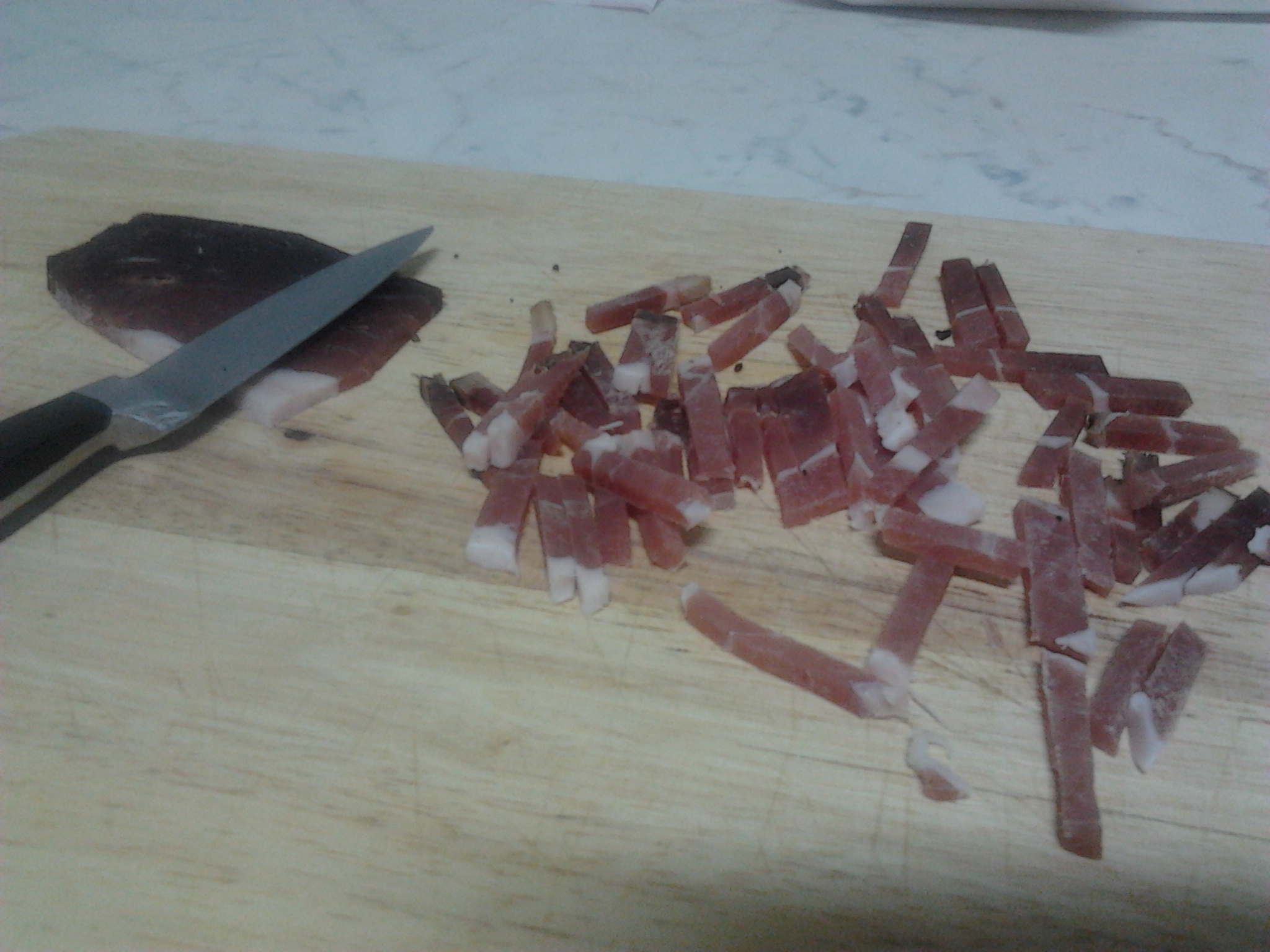 Tagliere lo speck a triscioline e mettere nel.Boccale, aggiungere la zucca a pezzetti e il sale.Tritare per 25 sec. vel.4, poi aggiungere 260 g.di acqua e cuocere per 20 min.90° Antiorario vel.2.